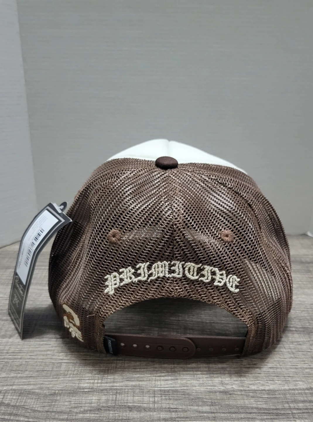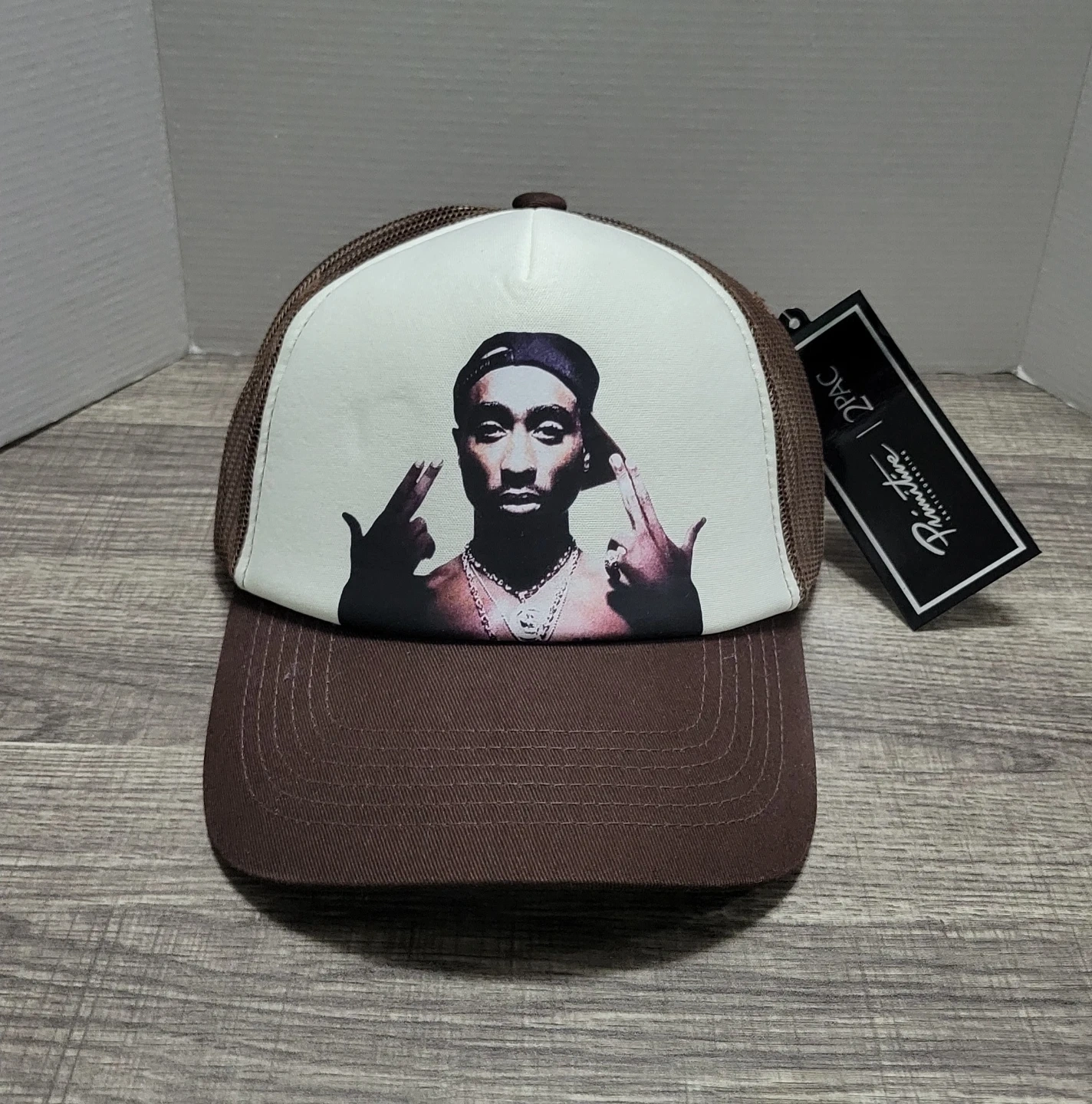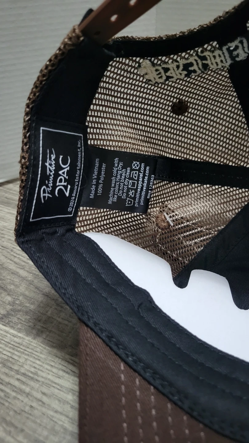 This is a Primitive brand trucker hat featuring a graphic of 2PAC. It's brown with a white front panel and mesh back. Made from 100% polyester.