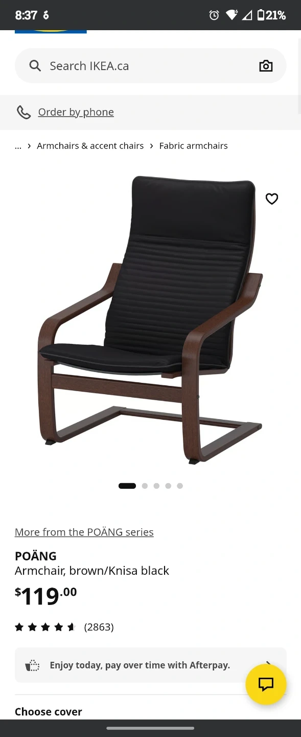 This is the IKEA POÄNG armchair in a brown frame with Knisa black upholstery. It features a bentwood frame and a comfortable, sprung seat and back.