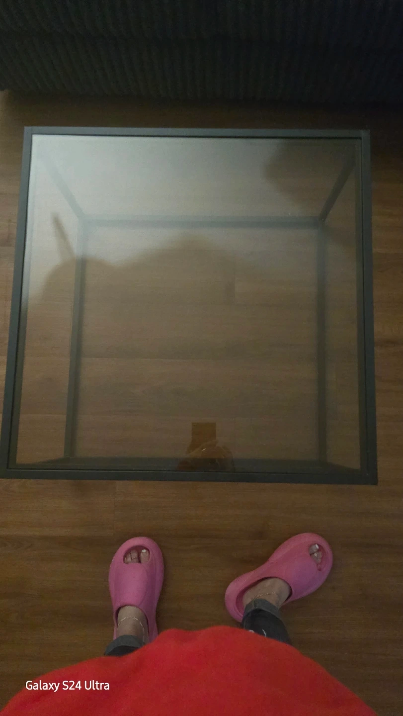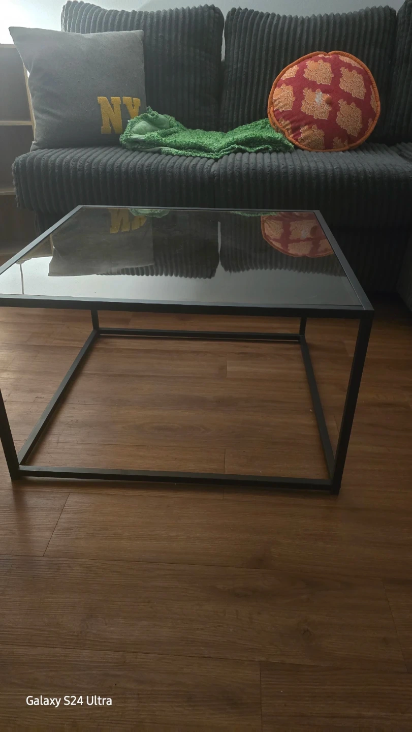 This square coffee table features a sleek black metal frame and a clear glass top. It's a contemporary piece that'll fit right into most living spaces. The tabletop is spacious for drinks and decor. Black metal frame, glass top.