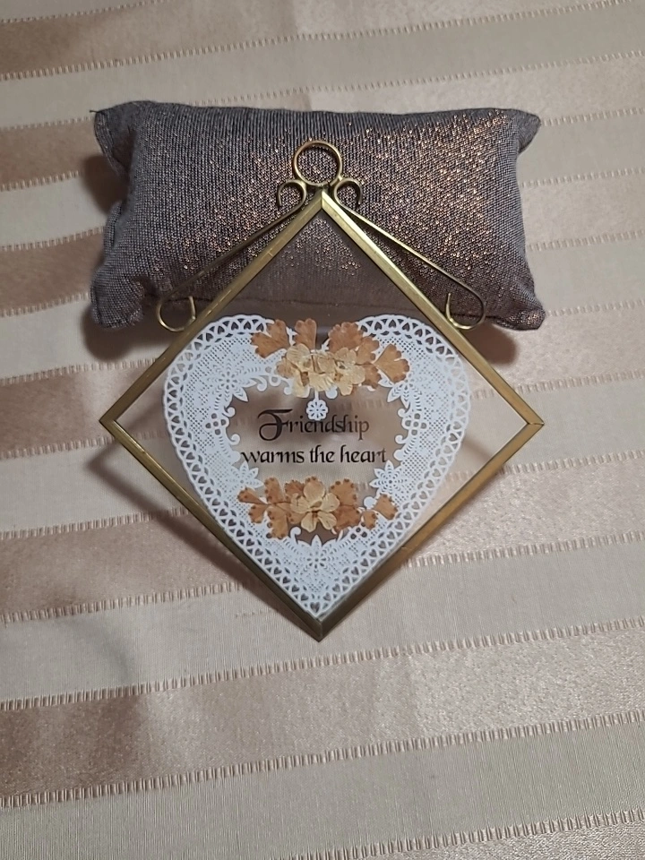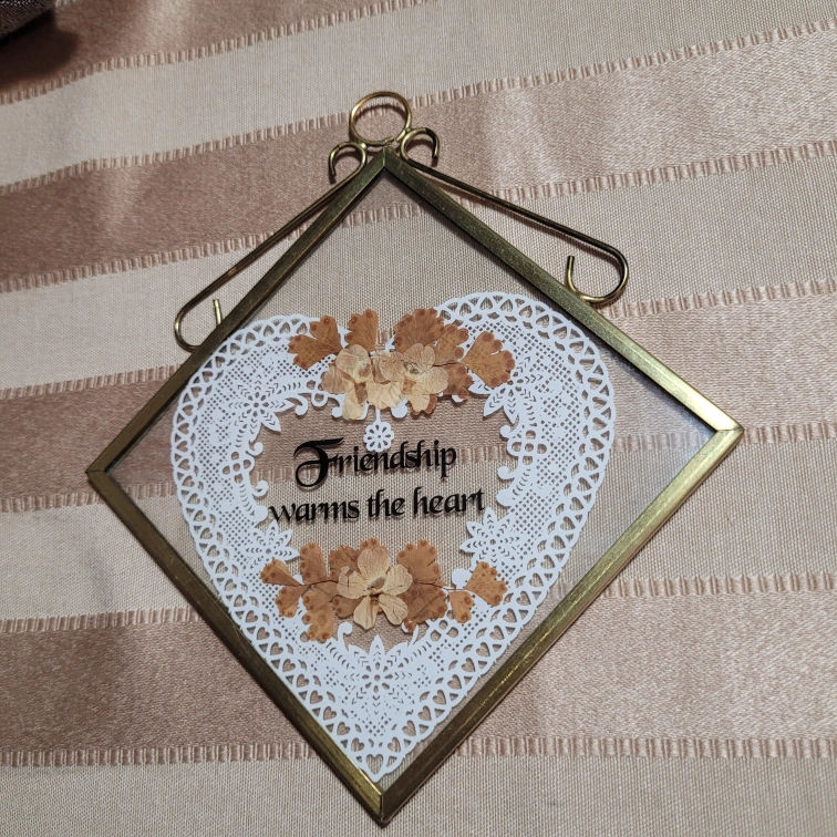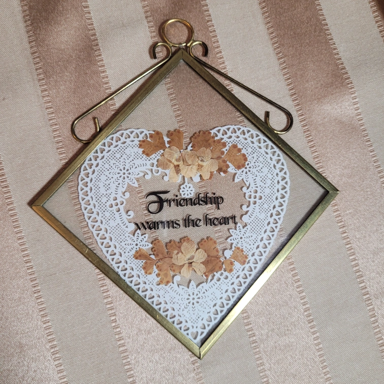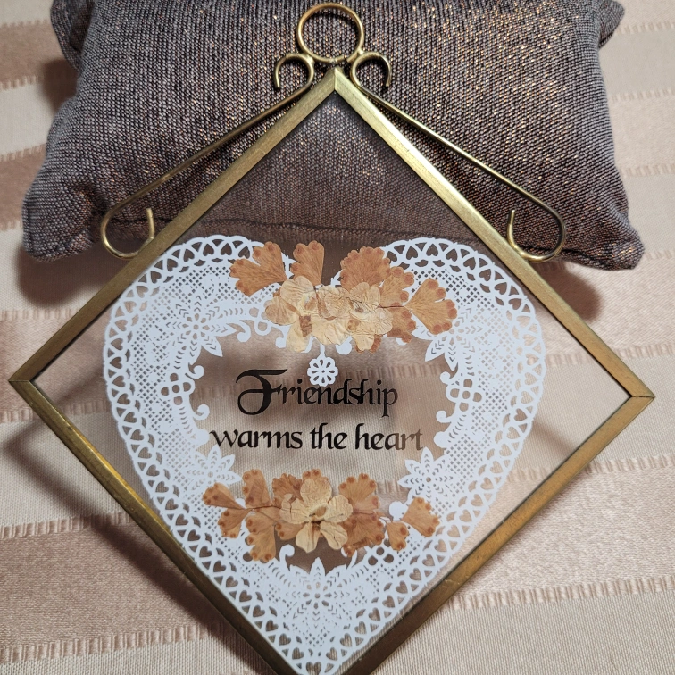 Beautiful Vintage 4" x 4" Friendship Warms the Heart Wall Decor Hanging Ornament Glass with Brass Frame Please See all pictures Please See all my Other Listings, Bundle & Save for a Better Deal! Located in Bradford, May be able to Meet, Shipping Offered at Buyers Expense, Please contact me for more Info & to make arrangements, sorry no holds without an ET, Thank you so much for Looking!