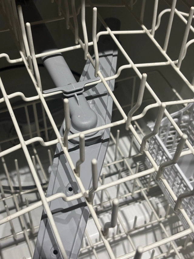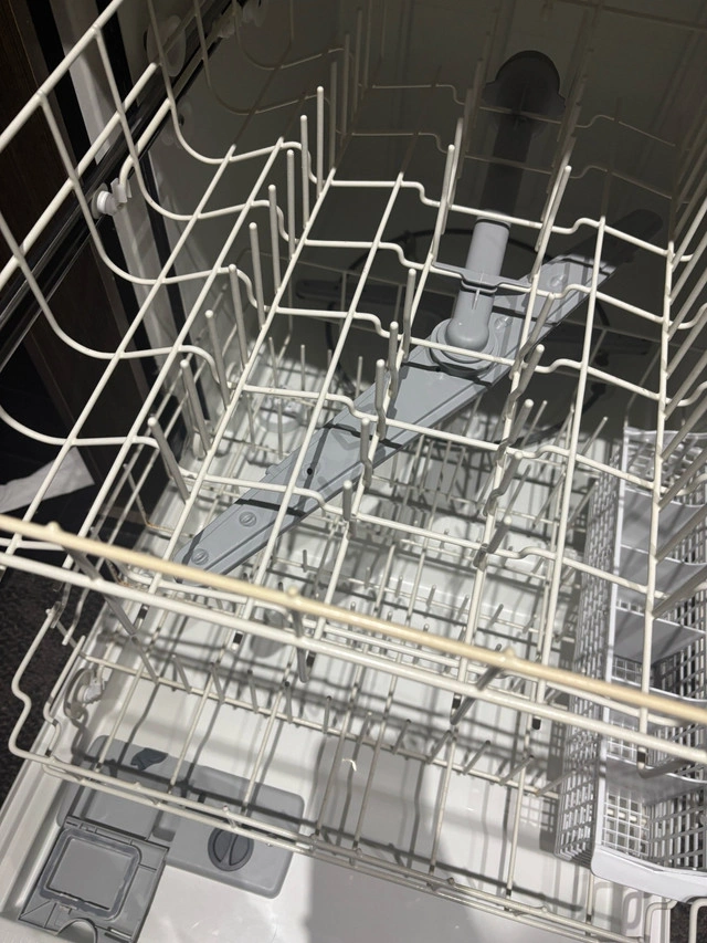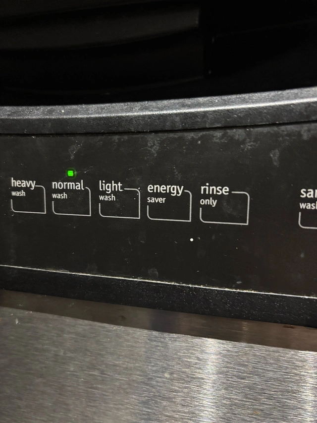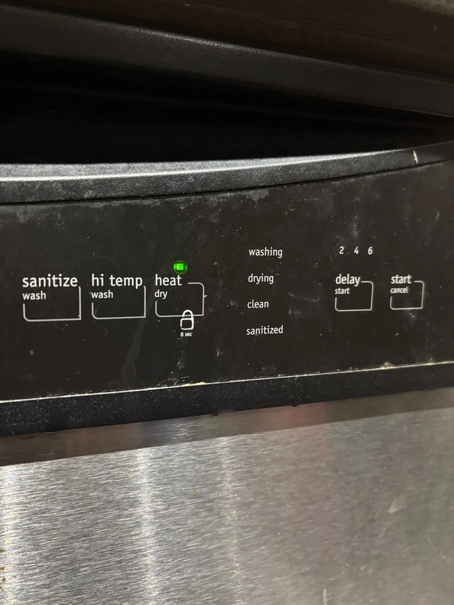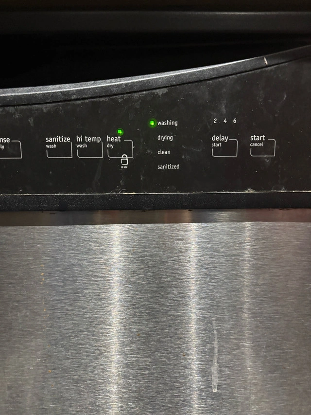 Selling a used dishwasher. Please see photos for condition. Works fine. The door hinge needs to be properly pushed to click.