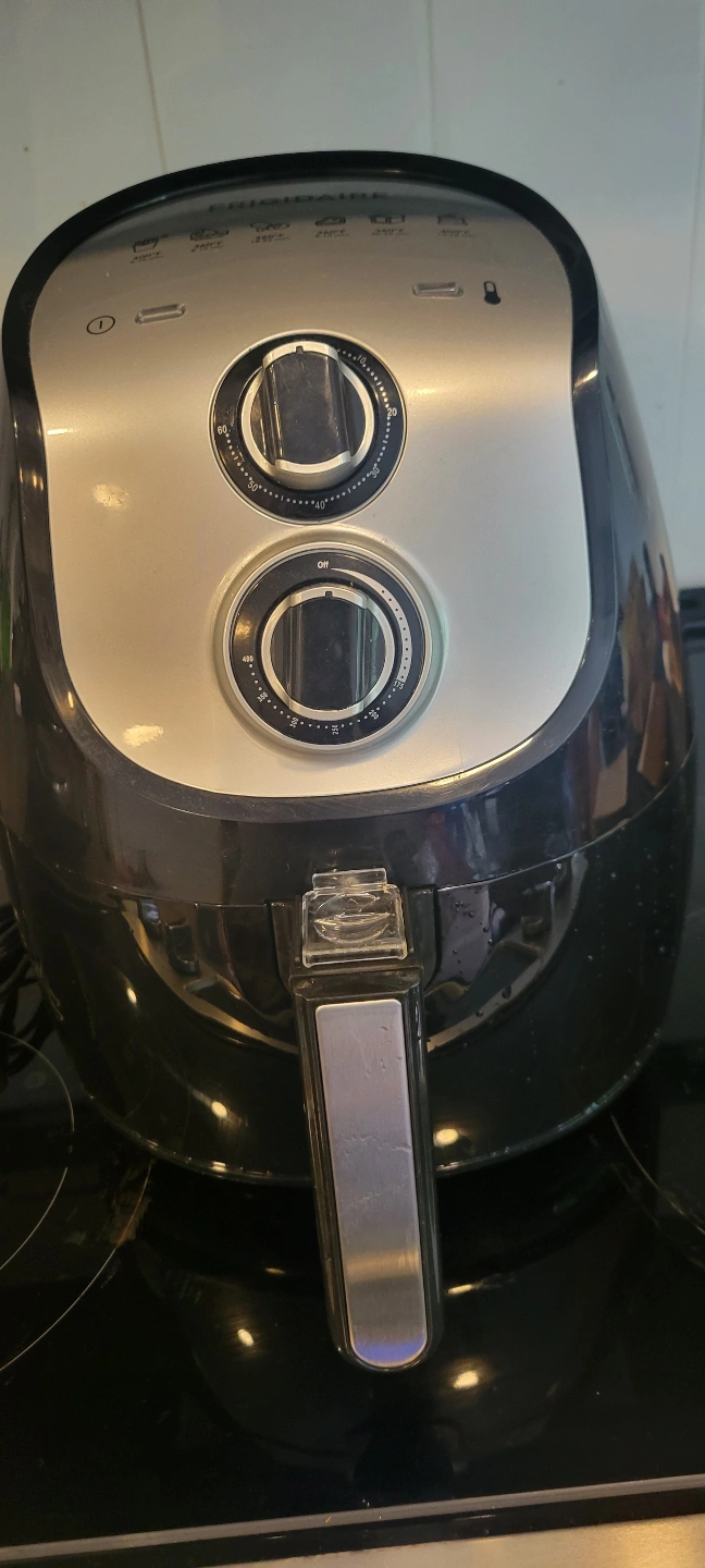 Appliance with black and silver details. Features a handle, dials, and indicator lights. A great way to make some yummy snacks and enjoy some peaceful time at home.