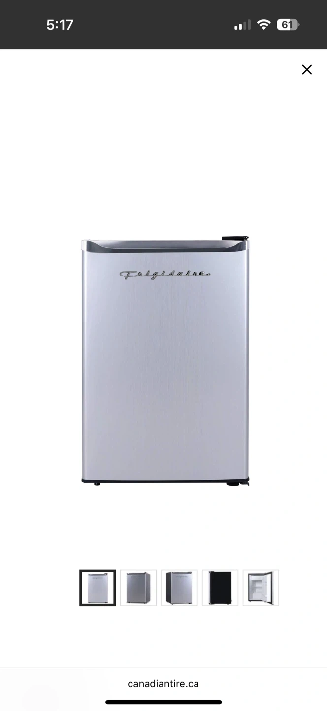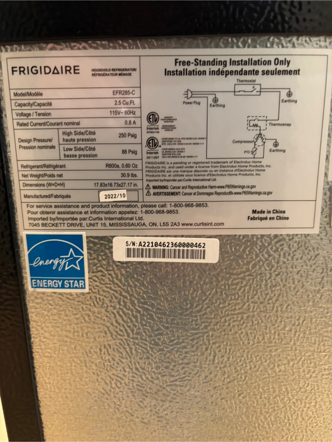 10Great condition. Small fridge with freezer. Gently used for 8 months at university! Great condition. Picture above give specs! Any questions please ask! Link to space at Canadian Tire https://www.canadiantire.ca/en/pdp/frigidaire-compact-refrigerator-2-5-cu-ft-4992619p.html?rq=frigidaire+fridge#nl-product-details
