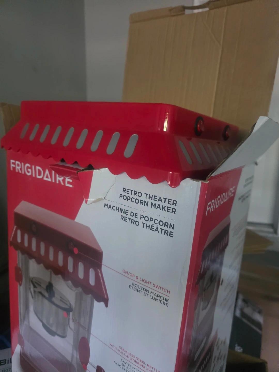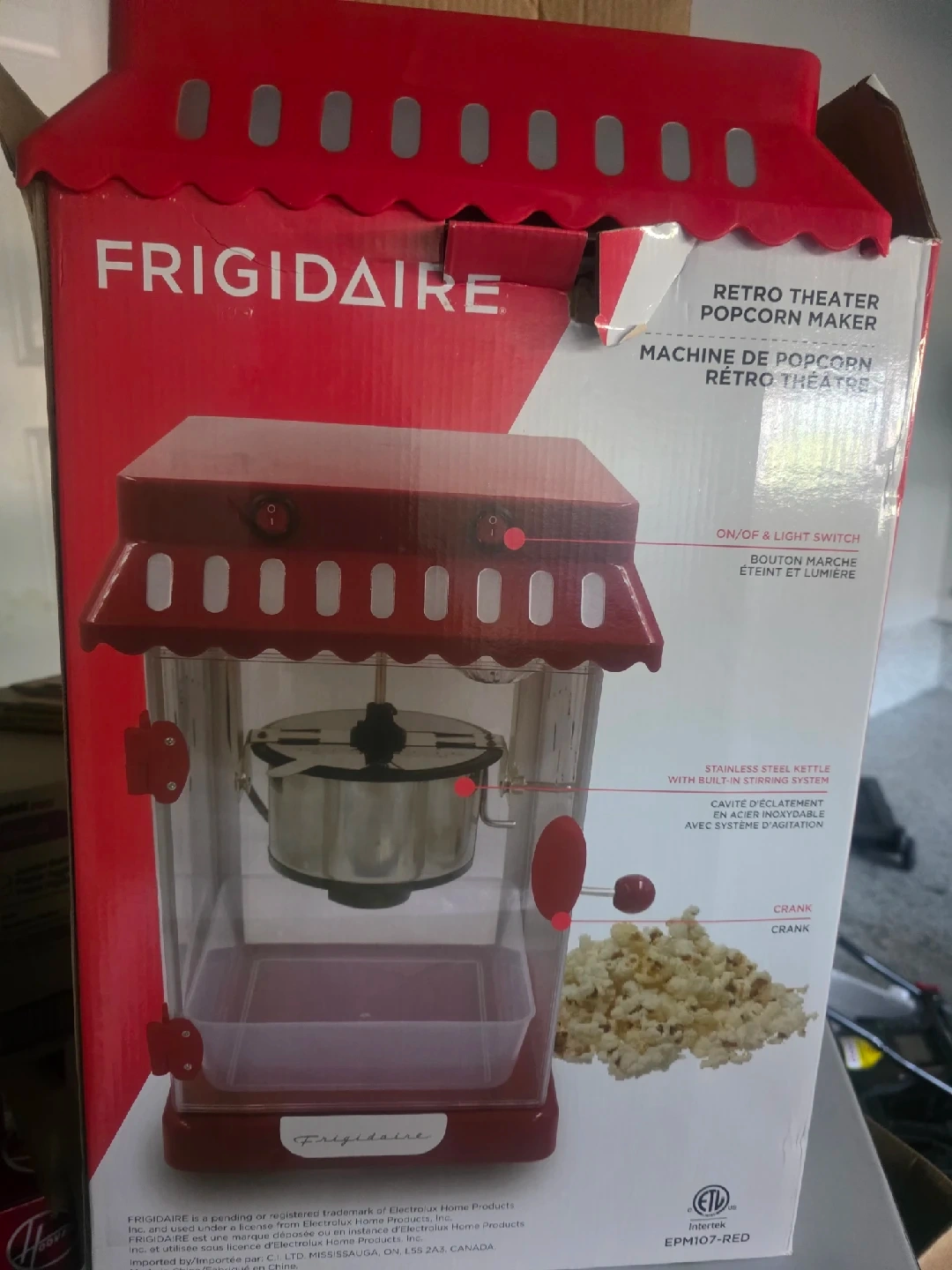 68Get ready for movie nights with this brand new Frigidaire Retro Theater Popcorn Maker! This machine features a stainless steel kettle with a built-in stirring system, and an on/off light switch. It's perfect for making delicious popcorn at home. Comes in the original box!
