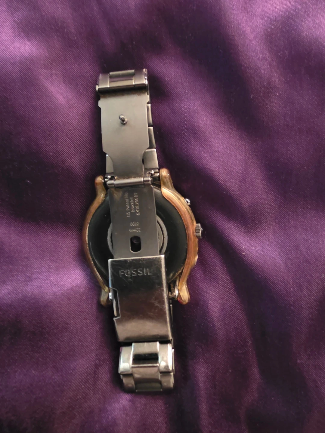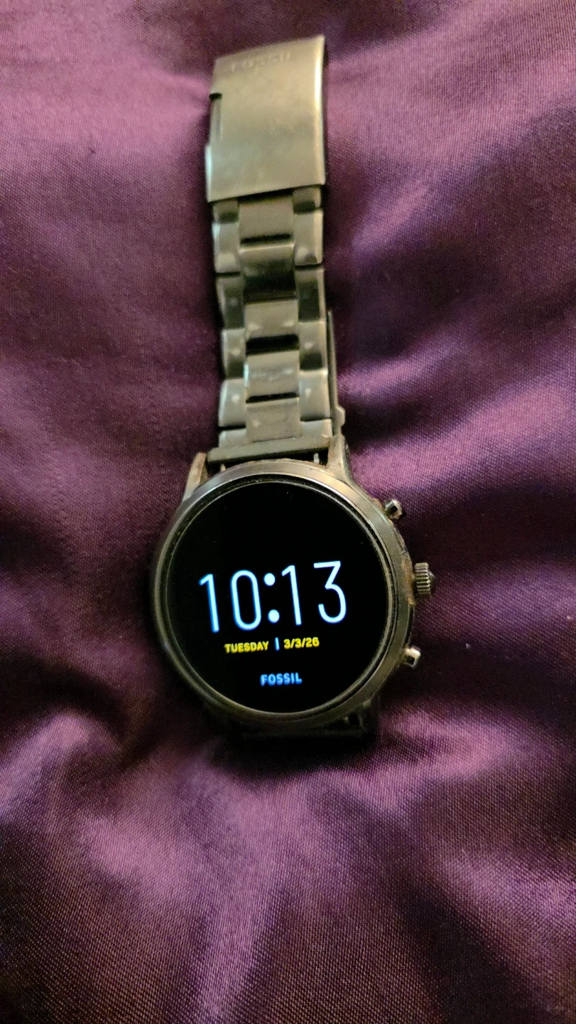 This is a Fossil Gen 5 smartwatch with a stainless steel band. It's in good working condition and comes with a screen protector The watch face is digital and shows the time and date.