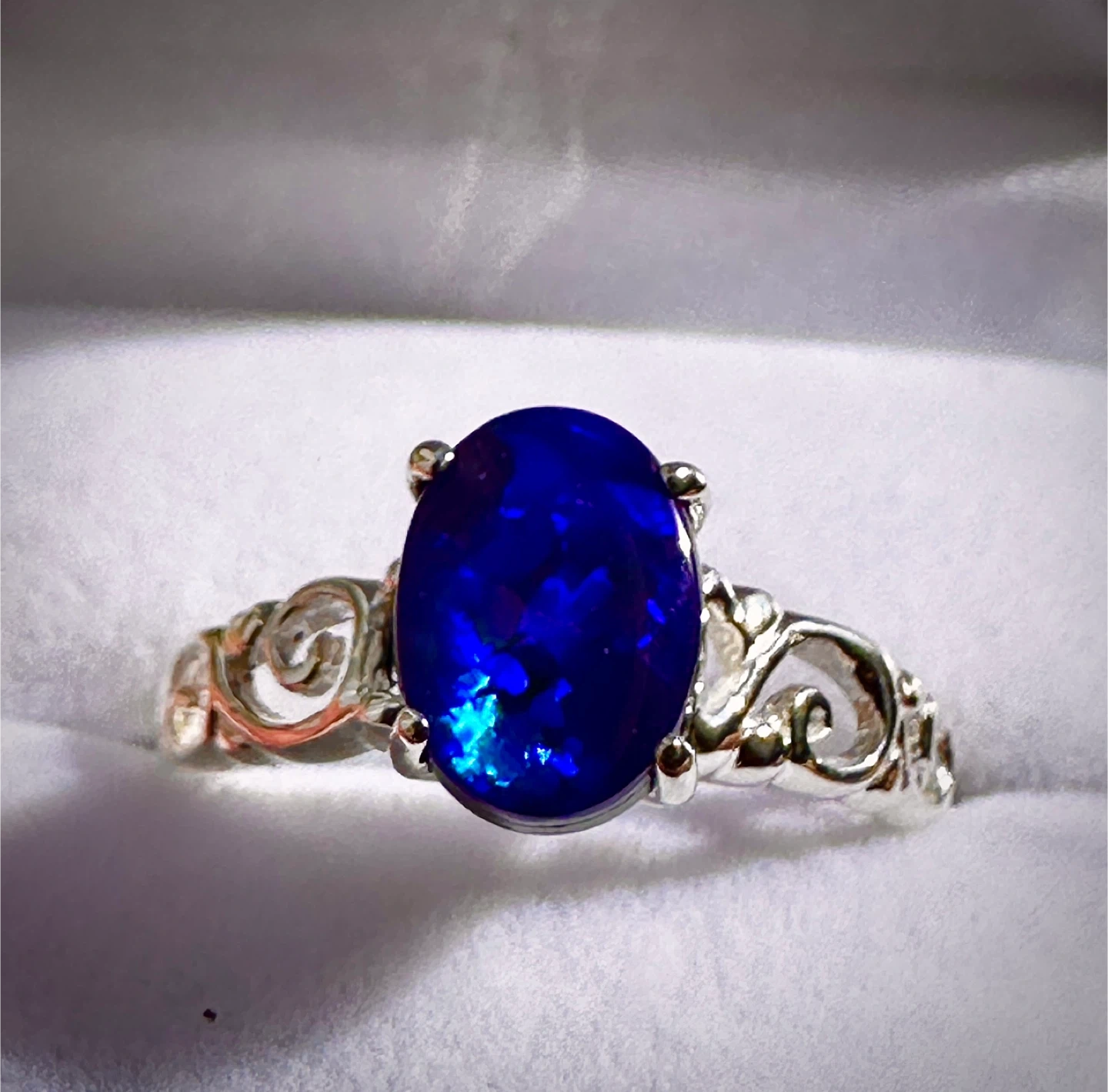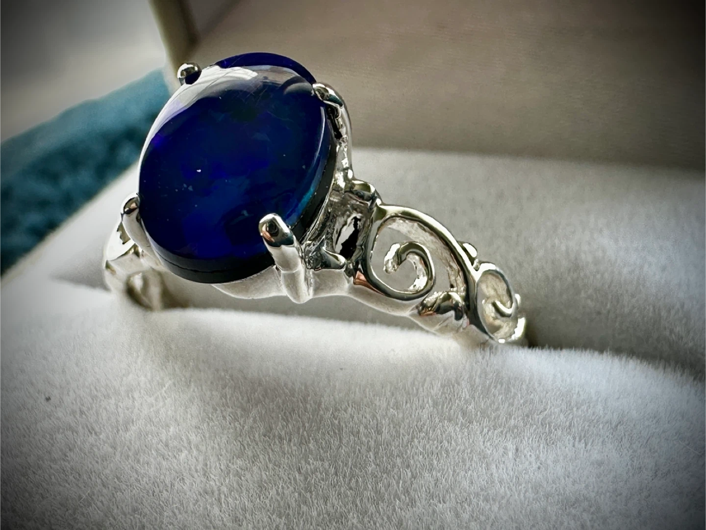 Brand New - This beautiful ring features a large, oval-cut Australian blue opal set in a sterling silver band. The band has intricate scroll detailing, giving it a vintage feel. The '925' stamp is visible, confirming it's sterling silver. It comes in a ring box.