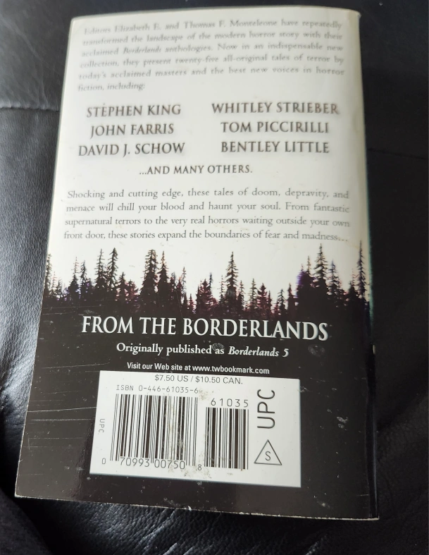 Selling a copy of 'From the Borderlands', a collection of stories of terror and madness. It features works by Stephen King, Whitley Strieber, and others. Edited by Elizabeth E. and Thomas F. Monteleone. A great read for horror fans!