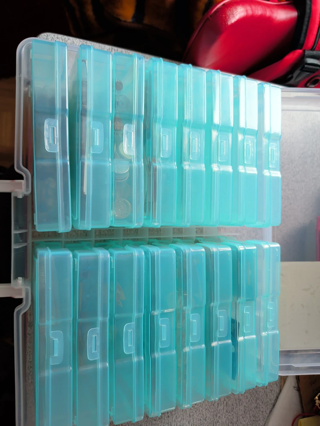 This is a clear plastic storage organizer box with multiple small compartments. It's great for storing small craft supplies like beads, charms, findings, and tiny bottles. The removable inner boxes help keep items sorted and tidy.