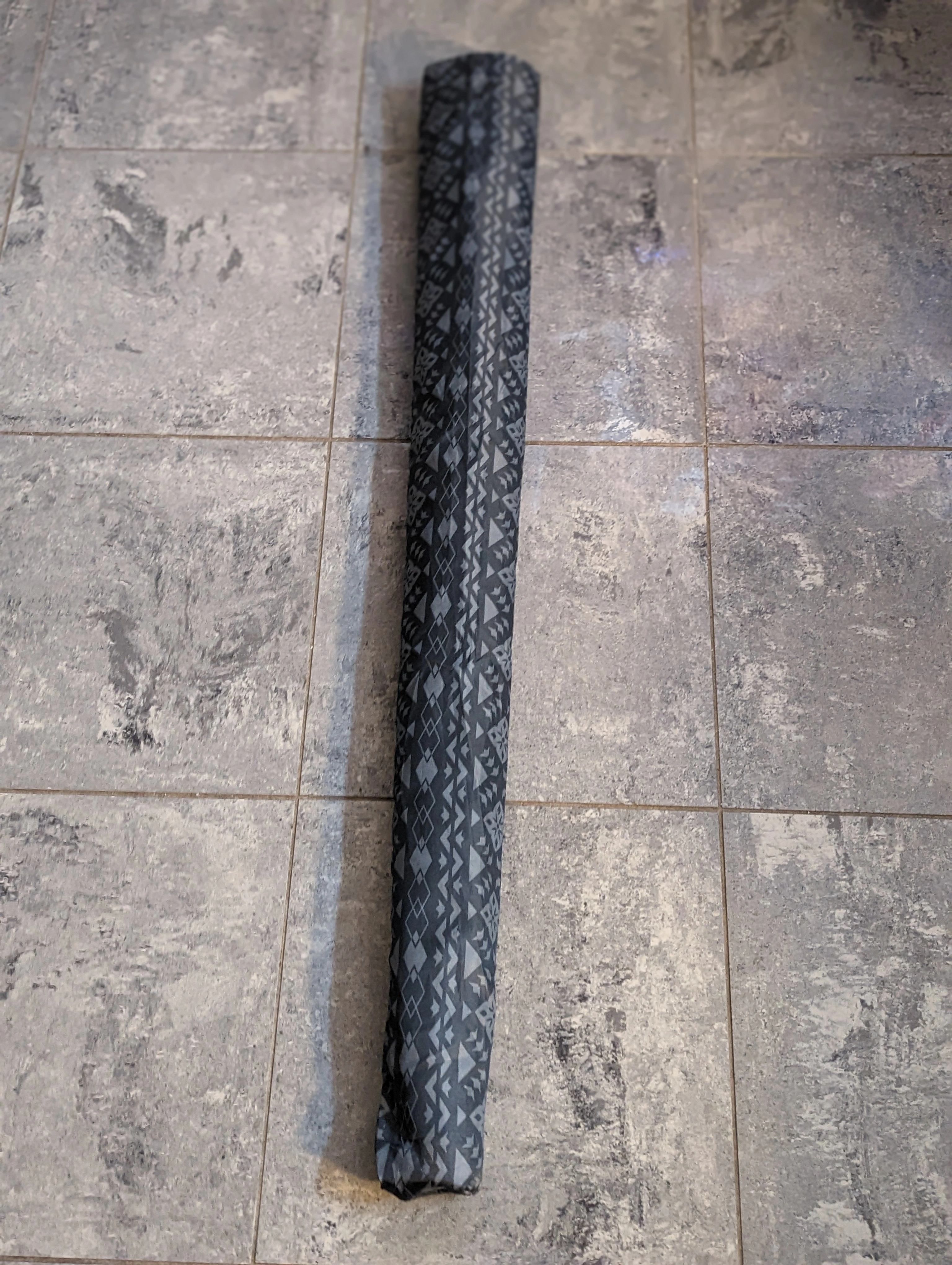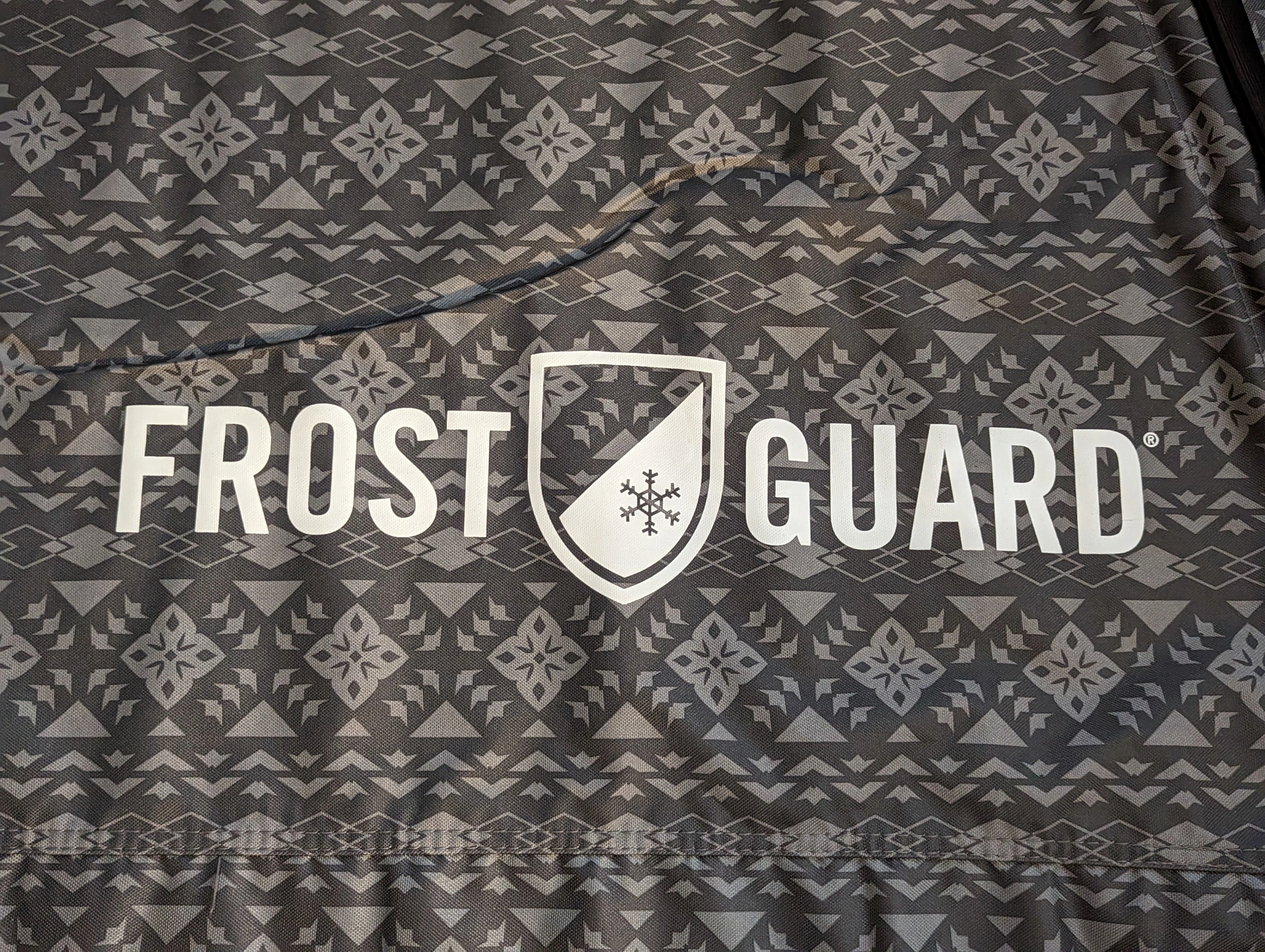 FrostGuard Windshield Cover Pattern described as "knit sweater" - gray background. This is a standard size - 59 x 41". Fits a car , SUV or a small truck (was previously used on Nissan Frontier and a Nissan Rogue. Has three adjustable elastic loops on either side to attach to your side mirrors. Bottom flap covers your wiper blades. Side flaps go inside the car doors so it won't blow away. Works great to prevent frost build up. Can also be used as a sun shade. Can no longer use as it won't fit my truck.