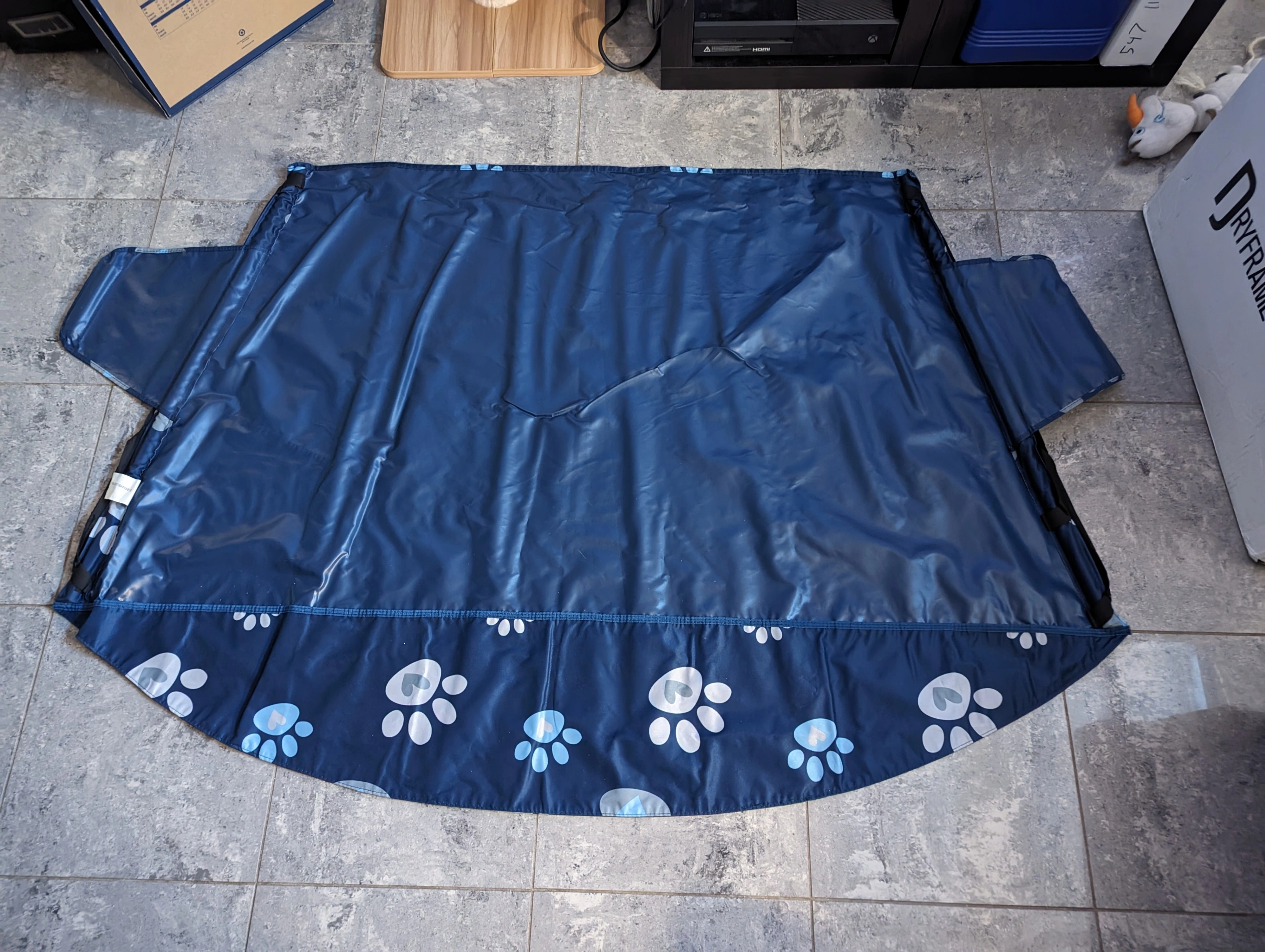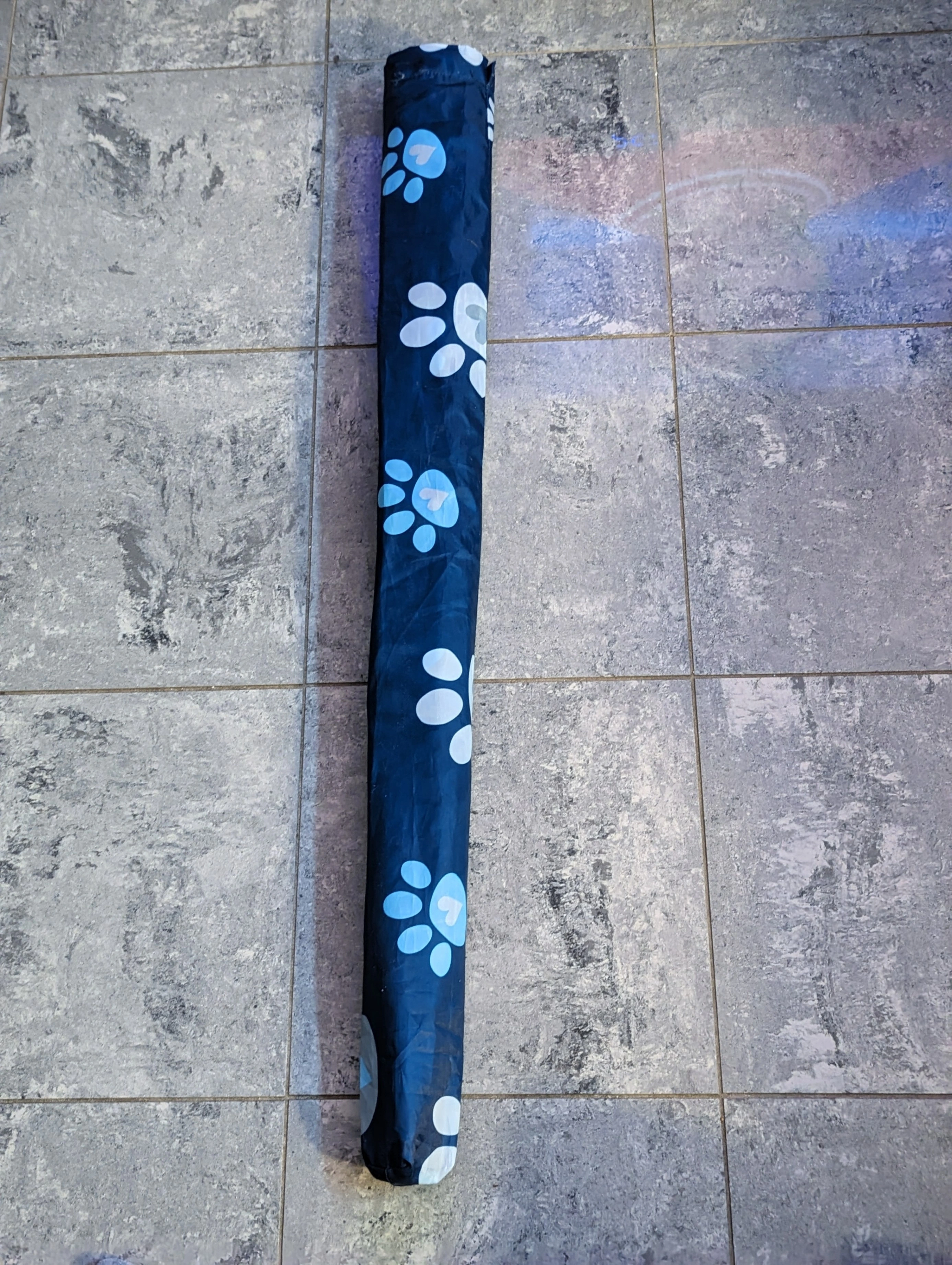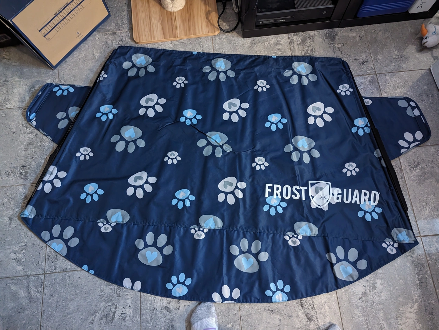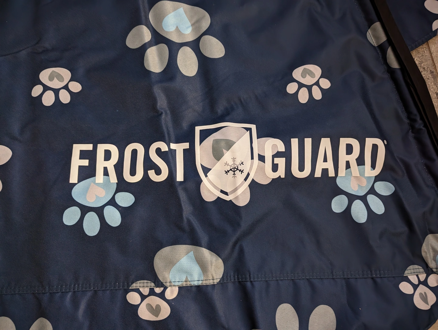 FrostGuard Windshield Cover Paw Print design on navy blue background. This is a standard size - 59 x 41". Fits a car , SUV or a small truck (was previously used on Nissan Frontier and a Nissan Rogue. Has three adjustable elastic loops on either side to attach to your side mirrors. Bottom flap covers your wiper blades. Side flaps go inside the car doors so it won't blow away. Works great to prevent frost build up. Can no longer use as it won't fit my truck. Comes with storage case in matching pattern.