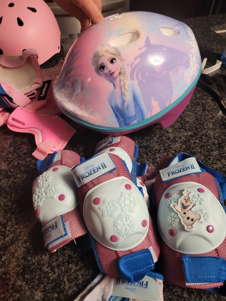 5Pink Frozen II helmet and protective gear. Includes knee and elbow pads. Great for cycling or skating. Suitable for children.