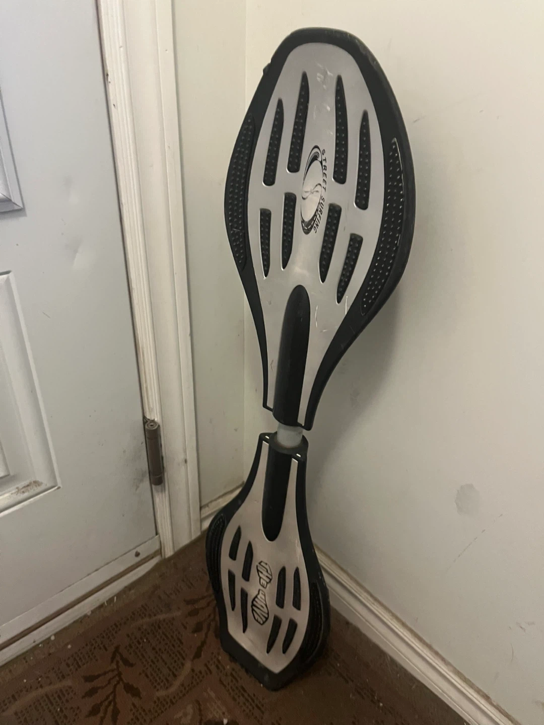 This is a Street Surfing wave board. It's black and silver with a split deck design and three wheels per side. It offers a unique way to cruise around!