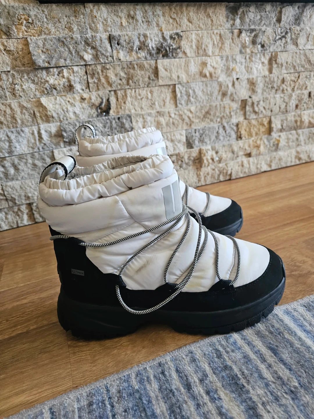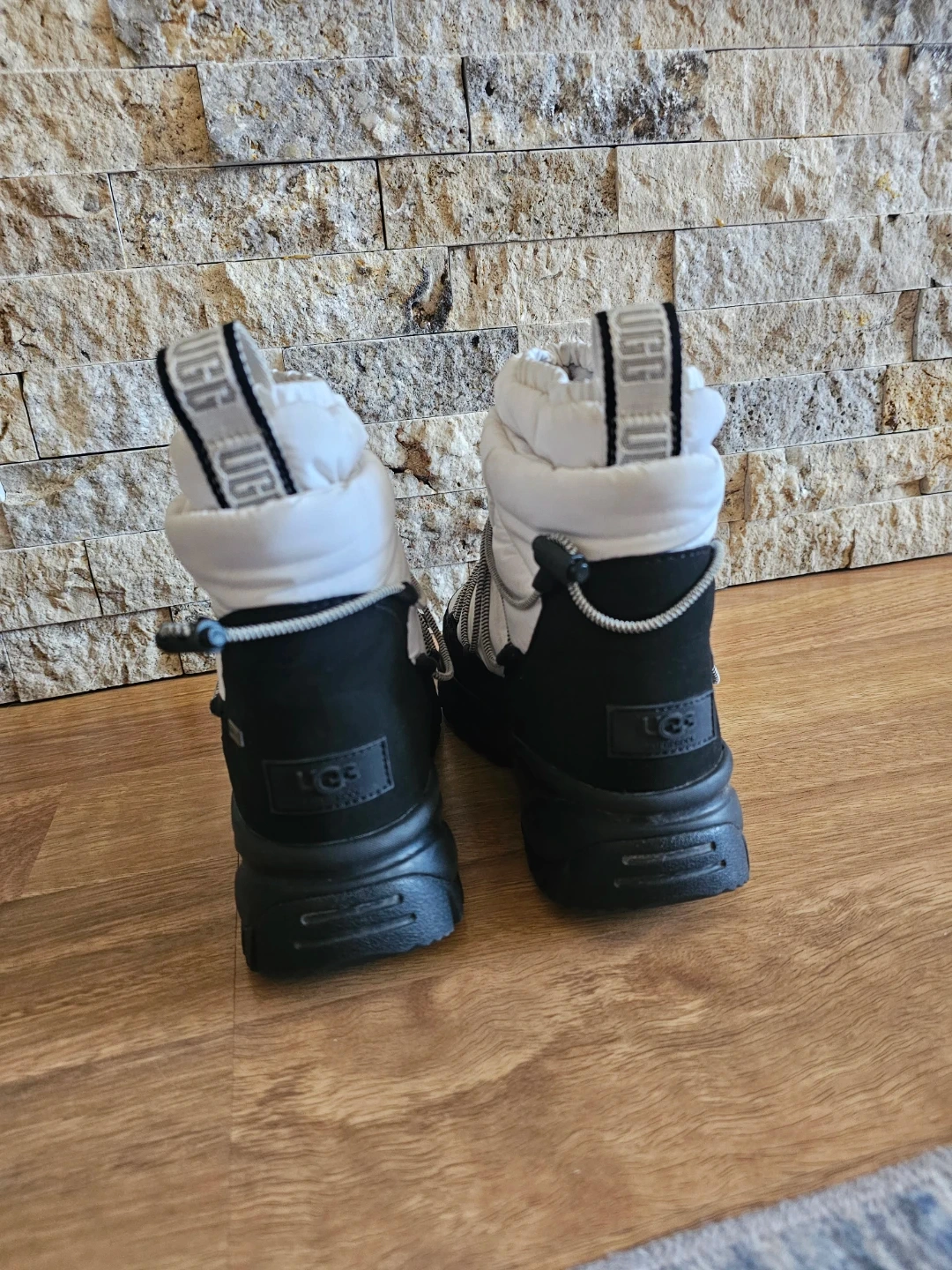 UGG women's Neumel Puffer boots in black and white. Padded shaft with UGG logo detailing and a secure lace-up closure. Durable rubber sole for traction. SIZE 8 feet size 7