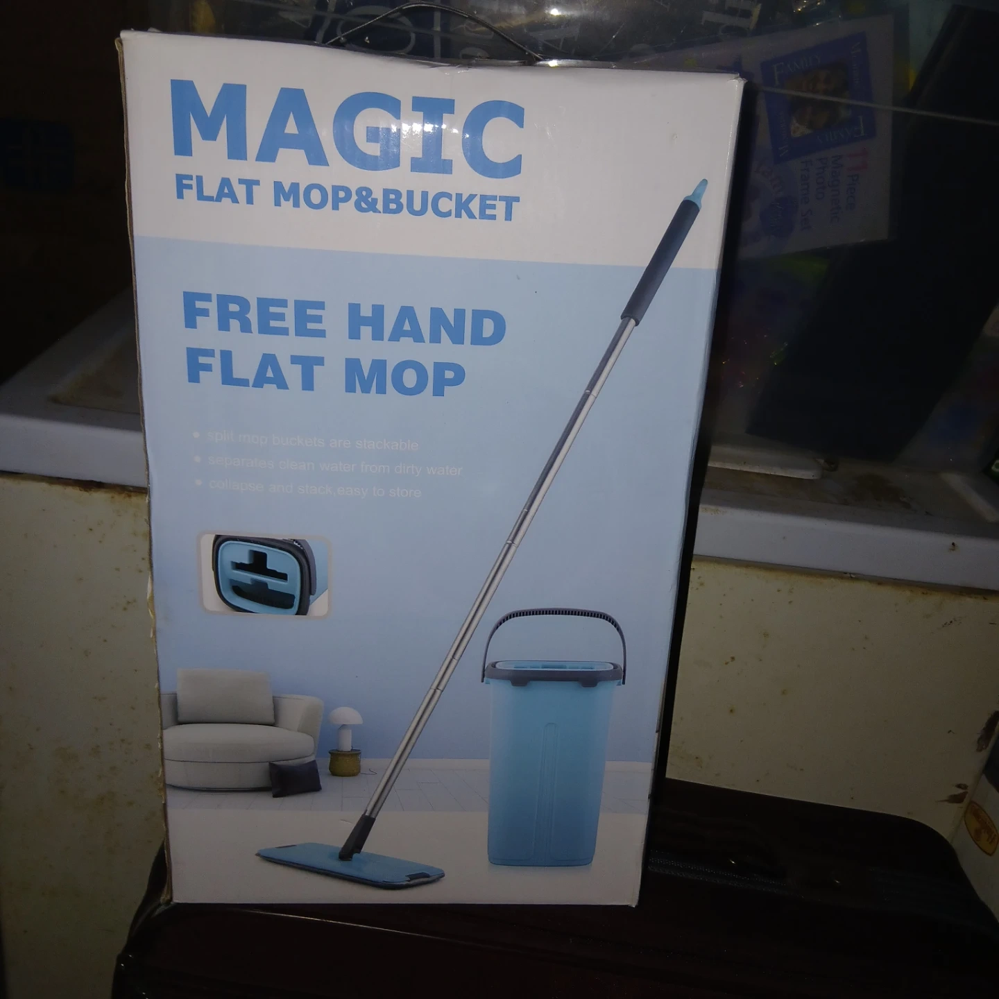 This is a MAGIC brand Free Hand Flat Mop and Bucket set. The mop buckets are stackable and separate clean water from dirty water. It's collapse and stack design makes it easy to store.
