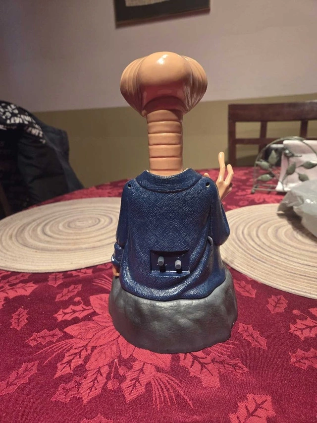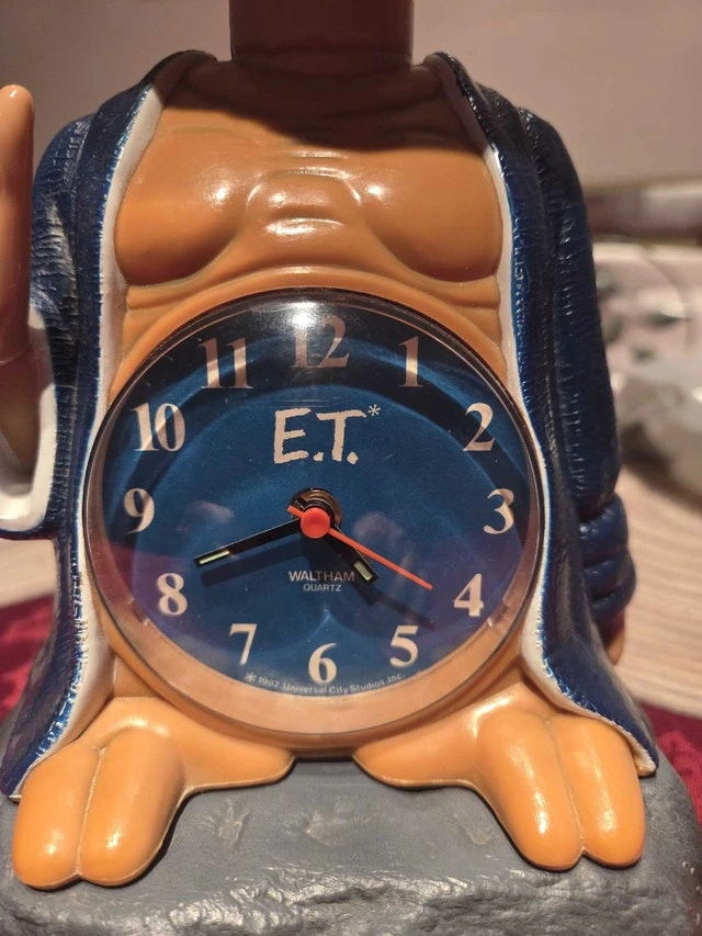 This vintage E.T. alarm clock is a nostalgic piece of pop culture memorabilia from 1982, featuring E.T. in a charming pose with a clock on his stomach. It's in good condition for its age and fully functional, ready to bring a touch of retro fun to your bedside table. This is a used item. Works great with no issues!