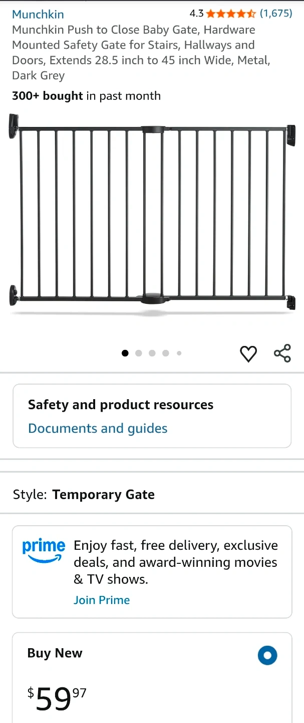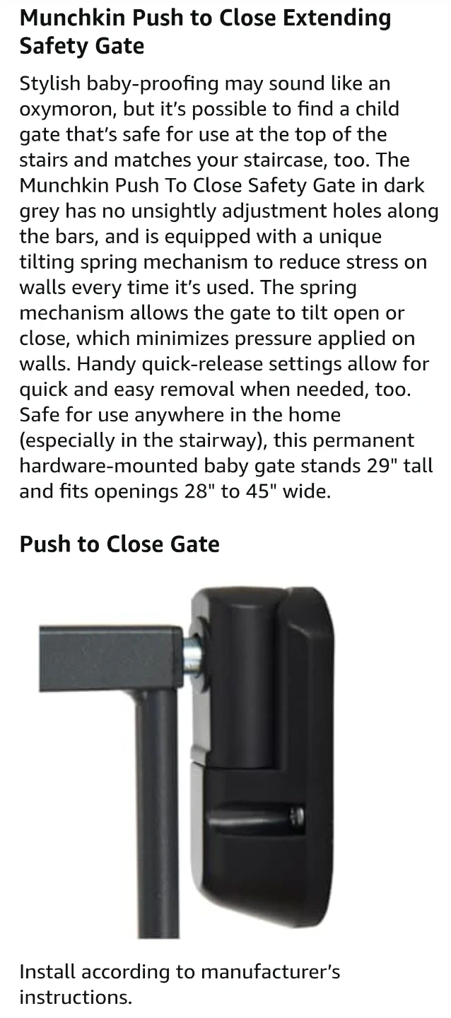 I'm selling a new Munchkin baby gate, perfect for keeping your little ones safe! This hardware-mounted safety gate is dark grey, made of metal, and extends from 28.5 inches to 45 inches wide. It's designed for stairs, hallways, and doorways, providing a secure barrier for children aged 6 to 24 months.