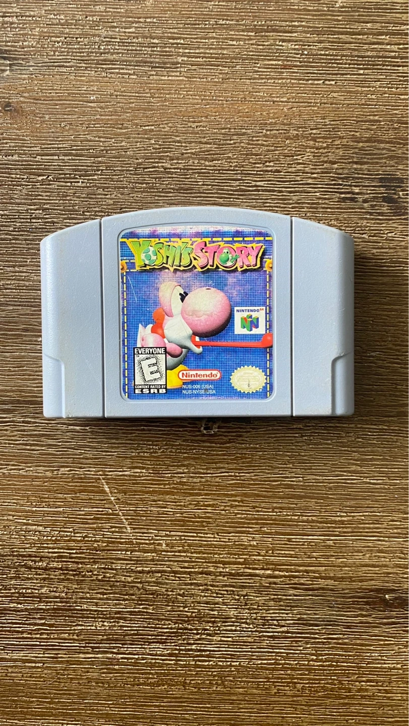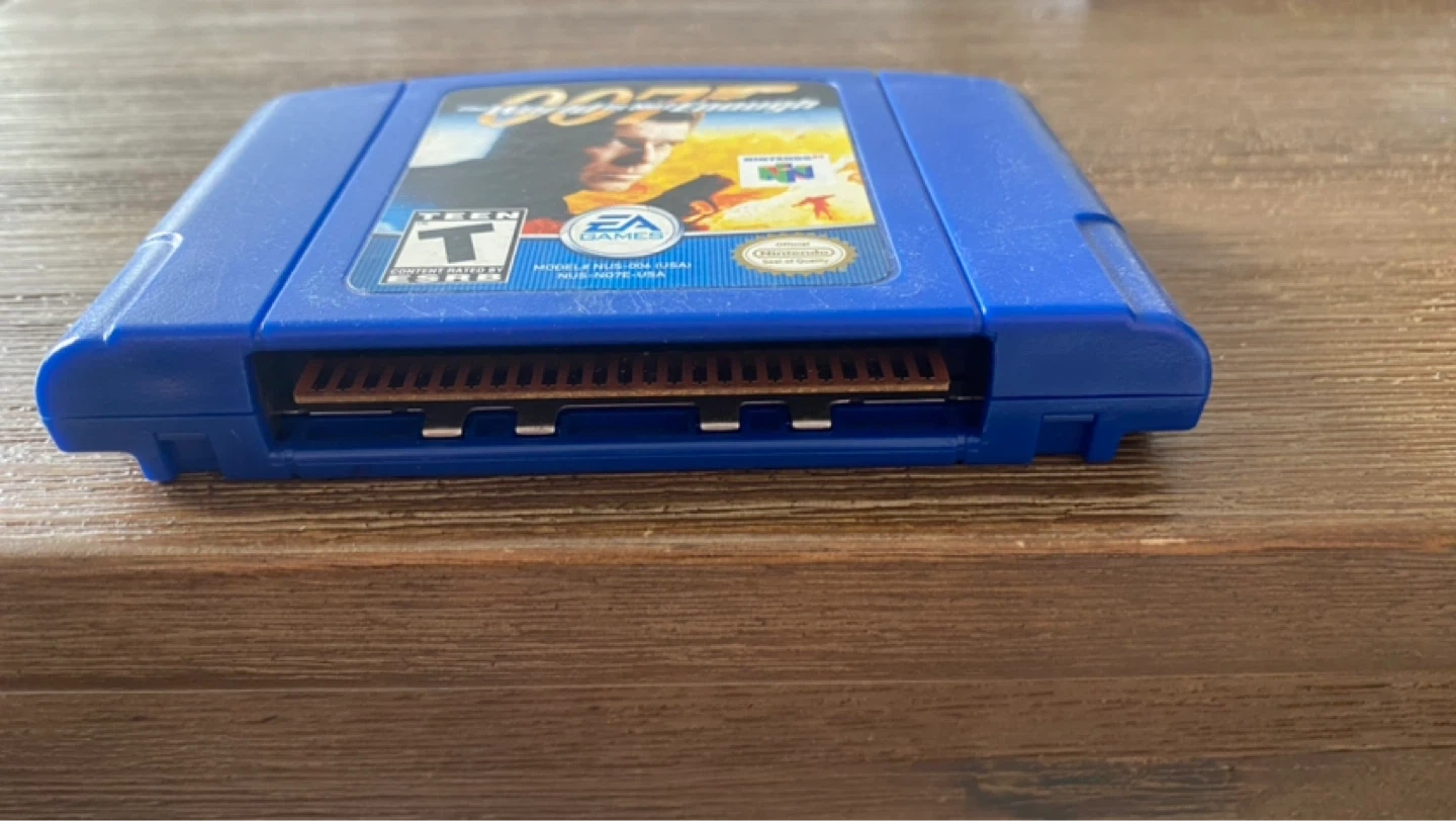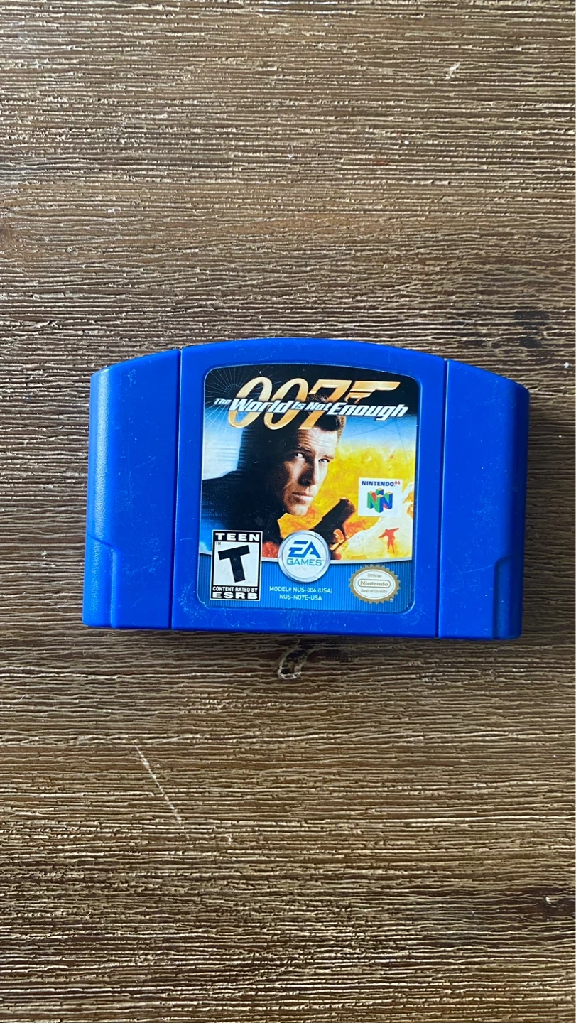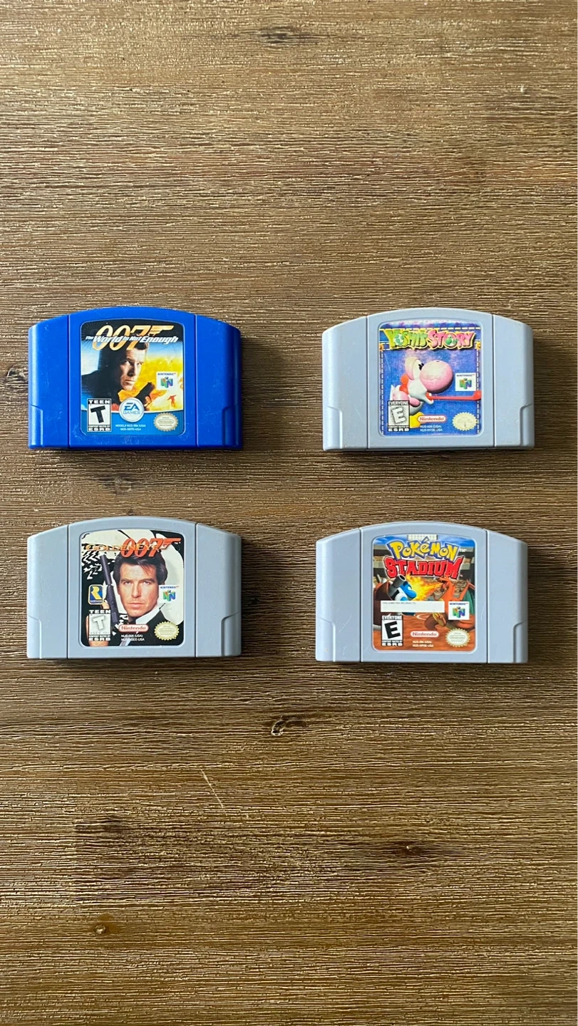 Nintendo 64 game cartridges: Yoshi's Story, 007 The World Is Not Enough, Pokémon Stadium and 007 Golden Eye. All cartridges are for the N64 system.