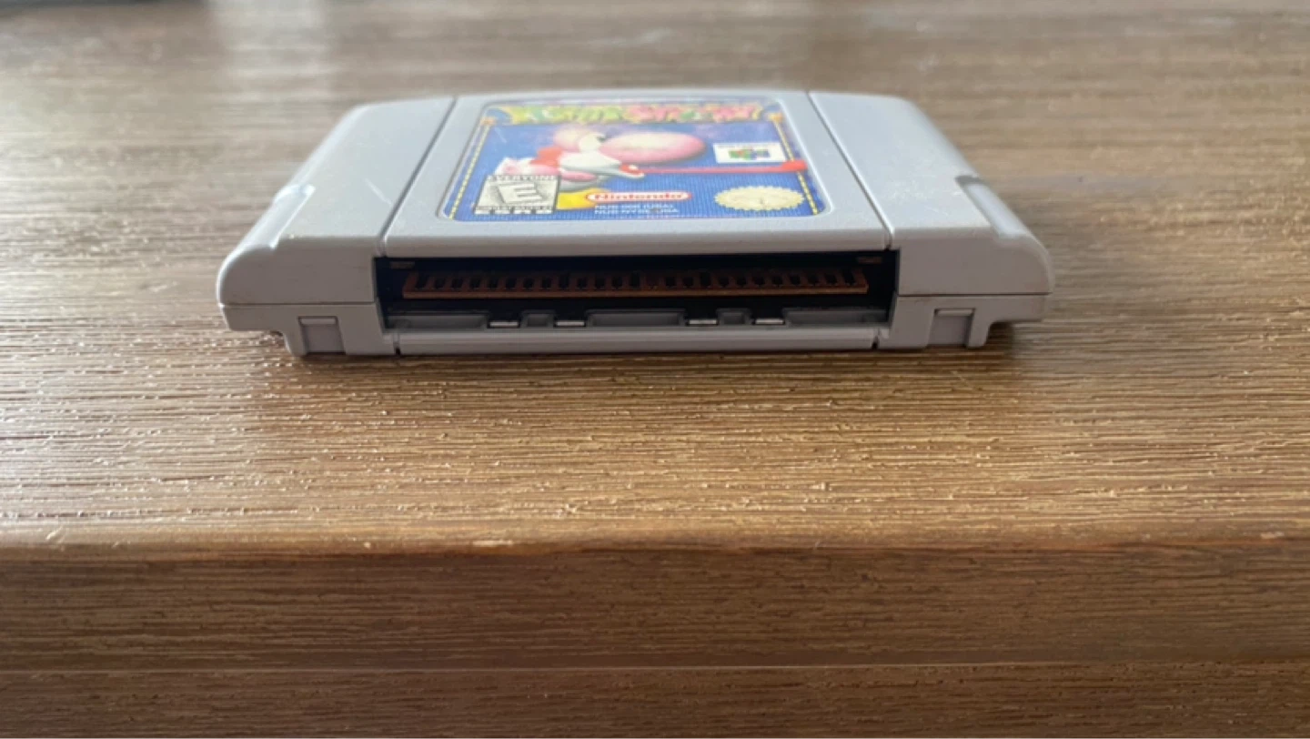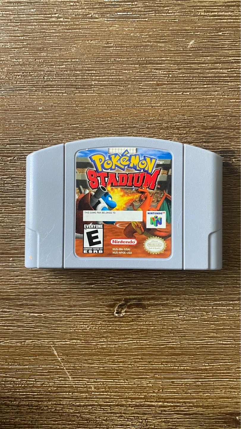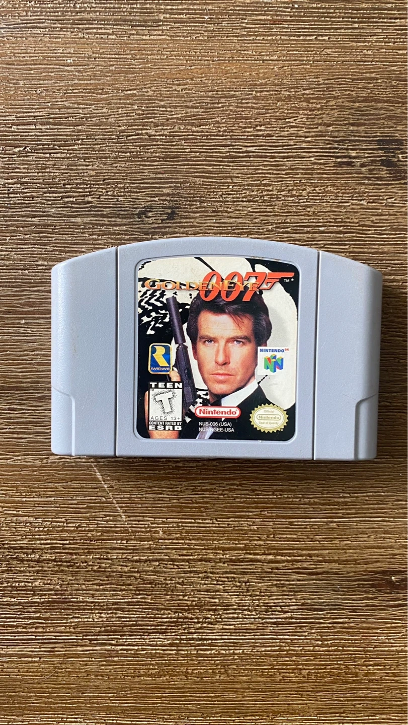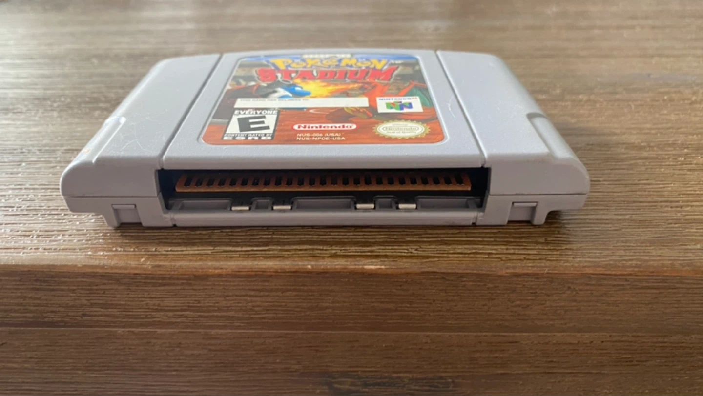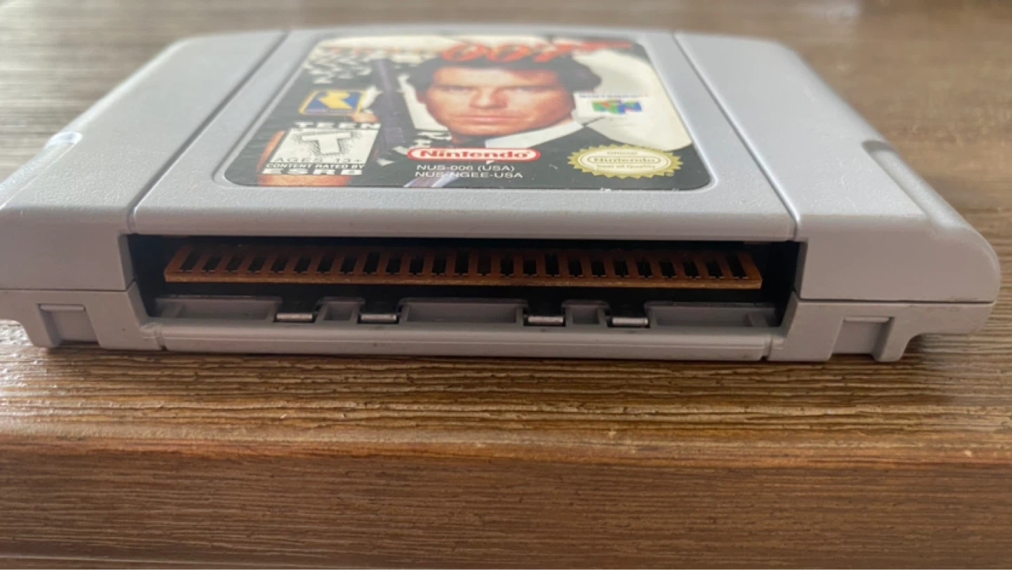Nintendo 64 game cartridges: Yoshi's Story, 007 The World Is Not Enough, Pokémon Stadium and 007 Golden Eye. All cartridges are for the N64 system.