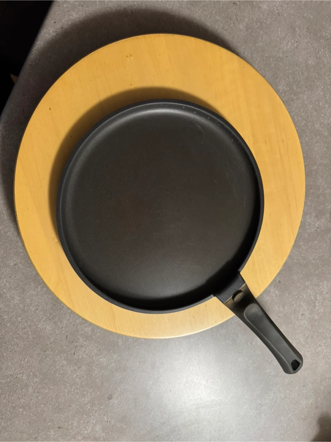 27Selling a fry pan flat in shape. The pan appears to be in good condition and ready for making delicious crepes. The diameter of the pan is approximately 10 inches, as shown in the photos. Perfect for your next brunch!