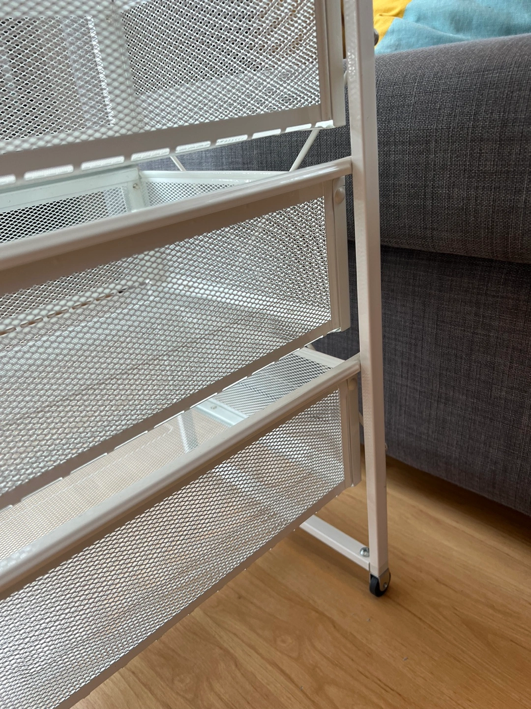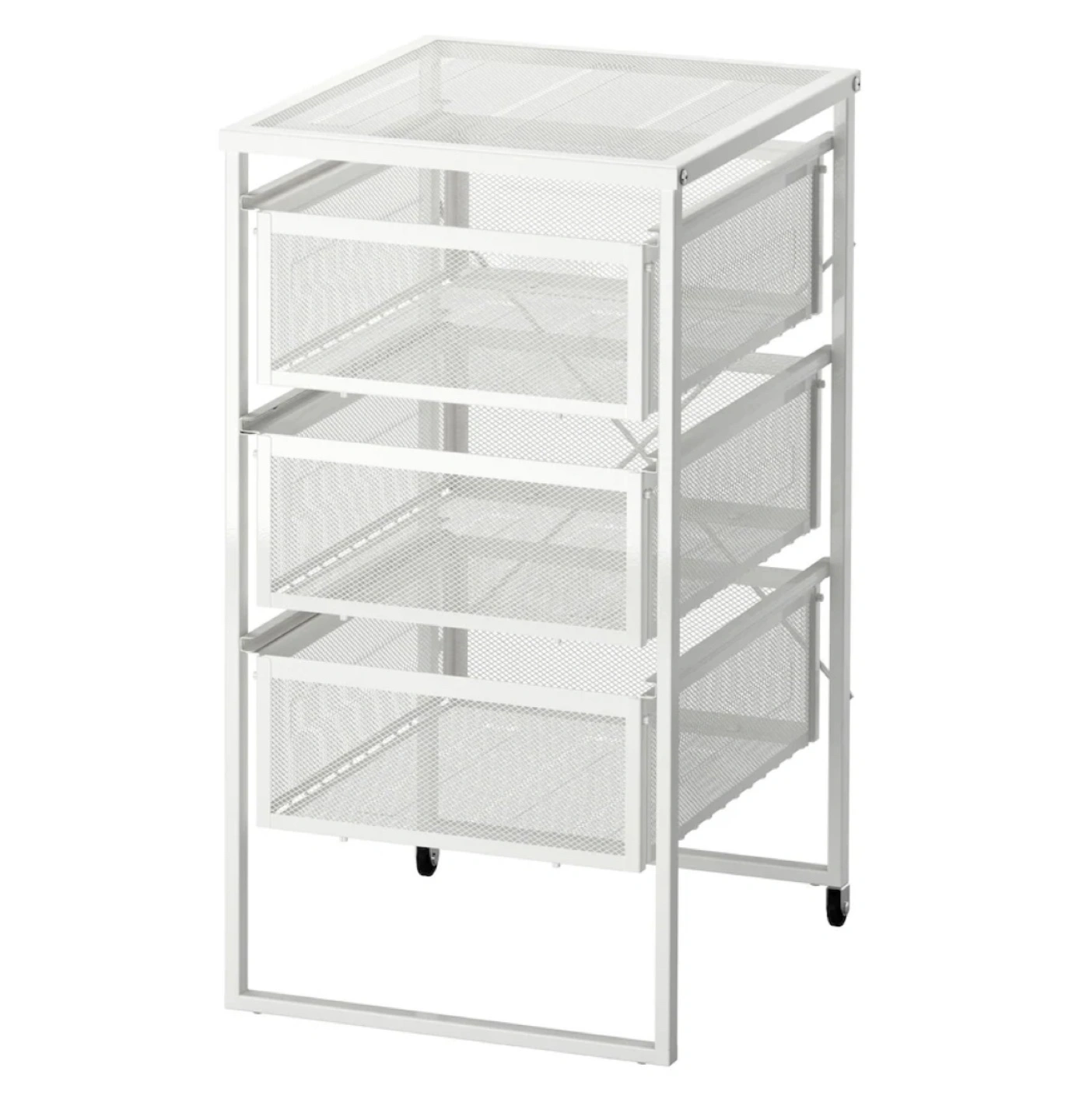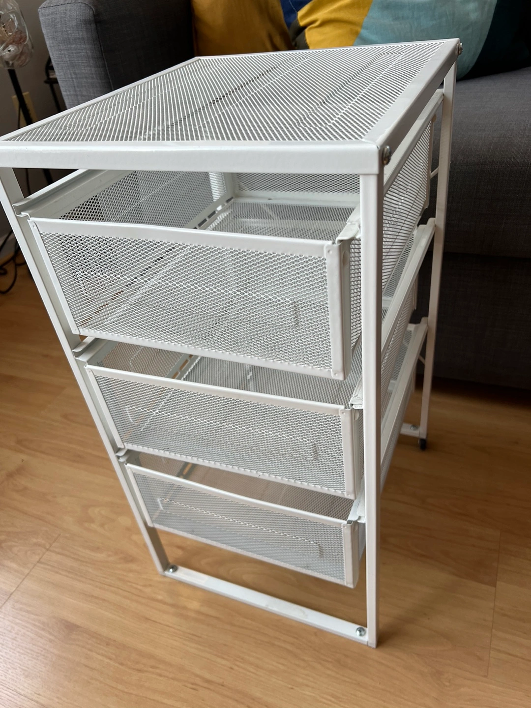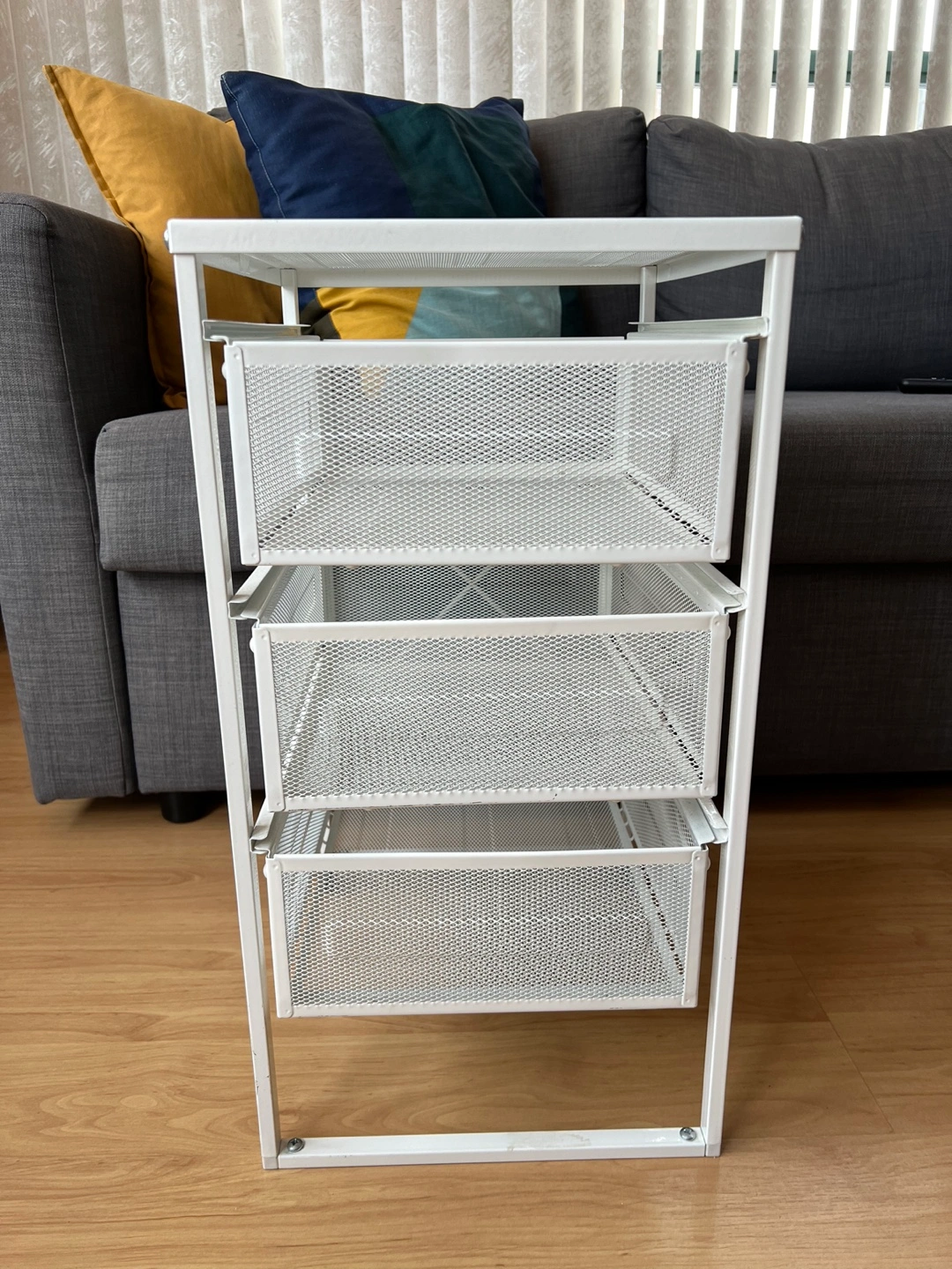 Three-tiered storage unit. Metal frame and mesh drawers. Perfect for organizing small items.
