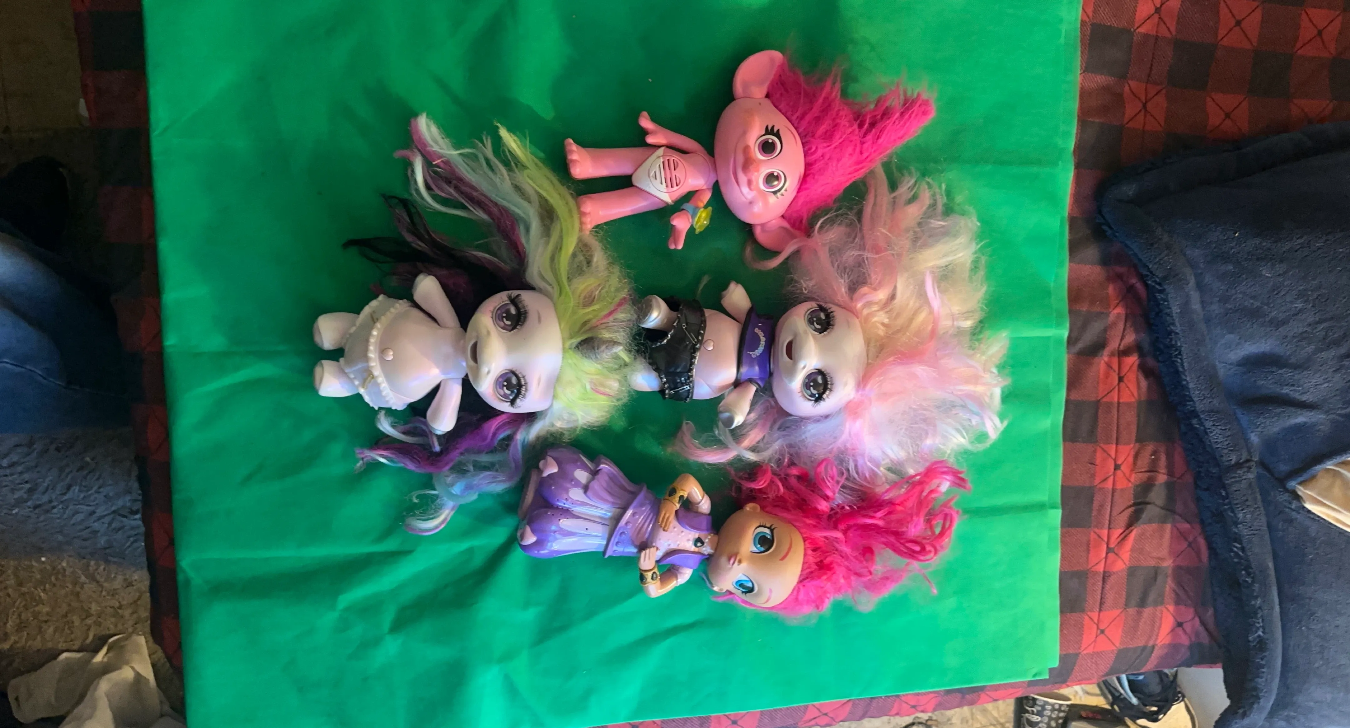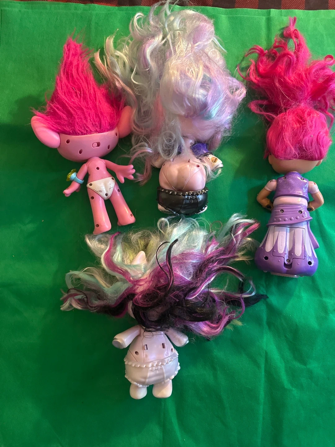 Set of five Trolls dolls. Includes various colorful hair. Dolls are made of plastic.
