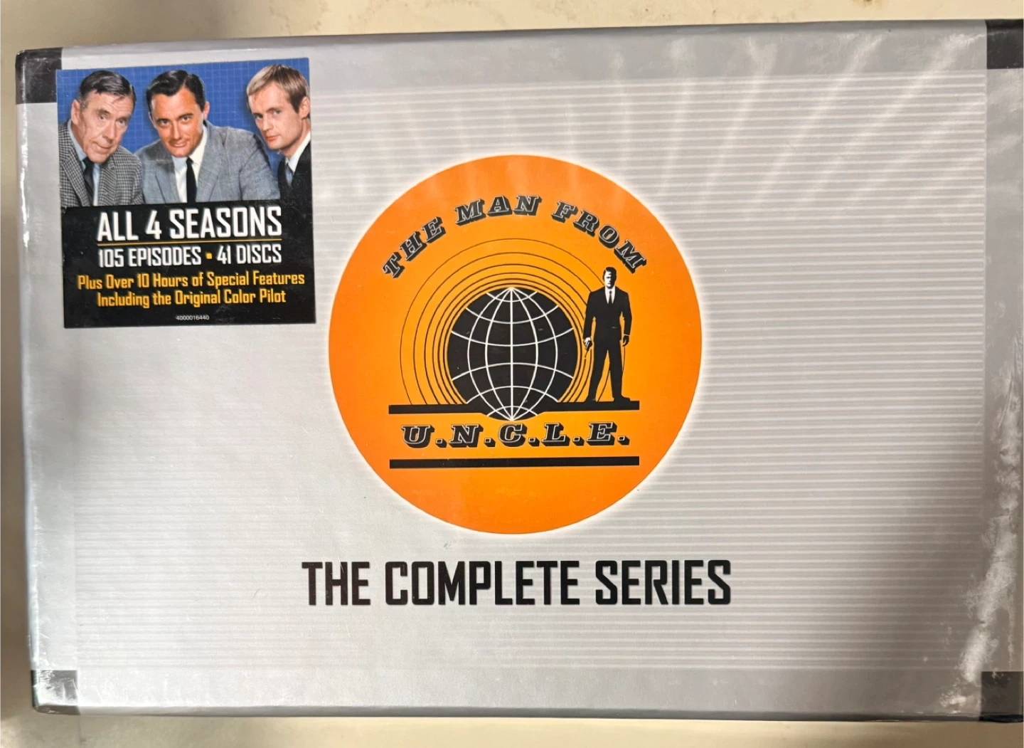 This is the complete series of The Man From U.N.C.L.E. on DVD. It includes all 4 seasons, totaling 105 episodes on 41 discs. Over 10 hours of special features are also included, plus the original colour pilot. This set is presented in a briefcase-style case with a handle and clasps.