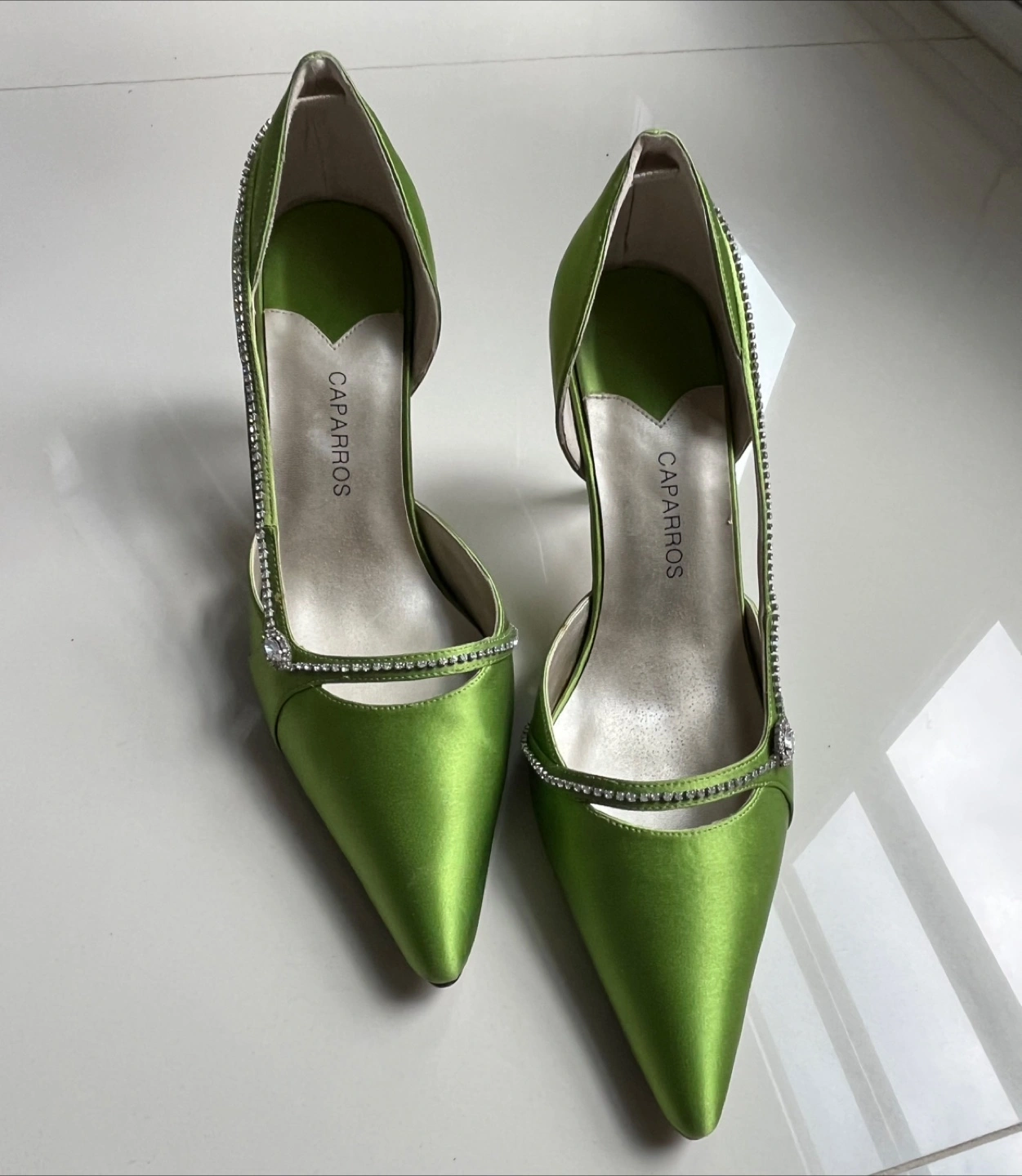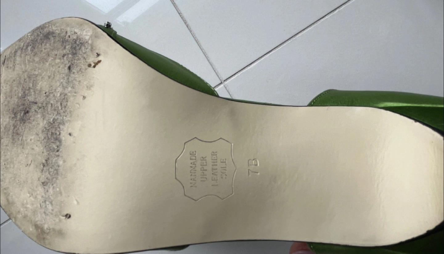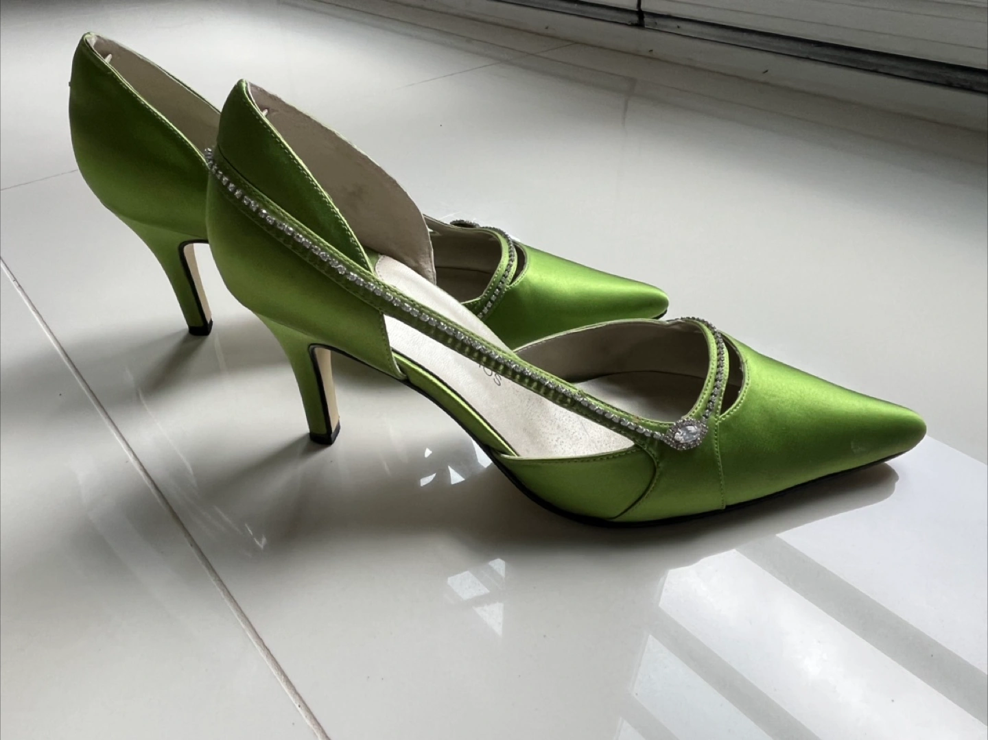 Man made leather sole and satin upper. They feature a dazzling rhinestone trim along the cut-out sides. The vibrant green colour makes them a fun choice for a night out! Comes with original box. Worn once for an event. Pick up only between Tuesdays through Thursdays.