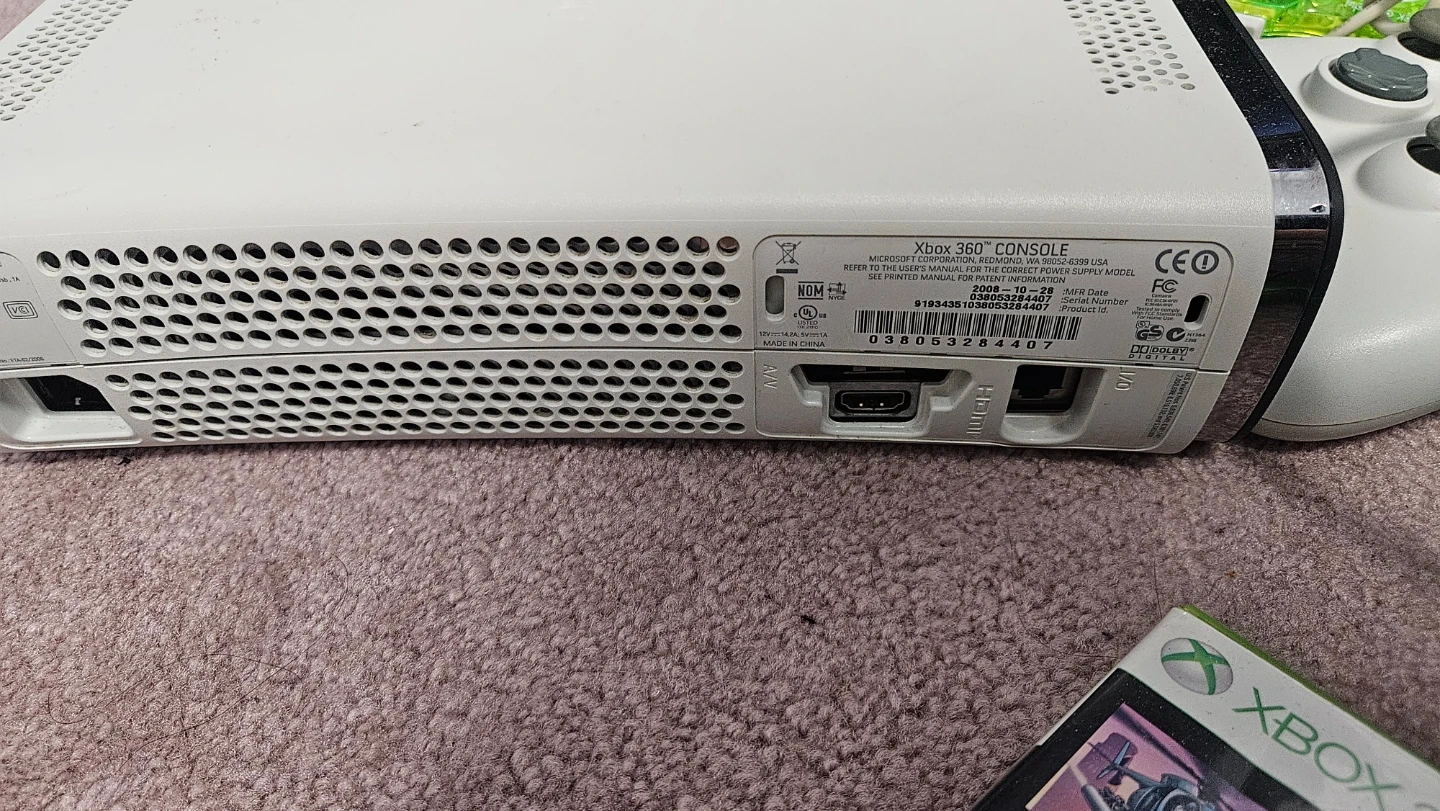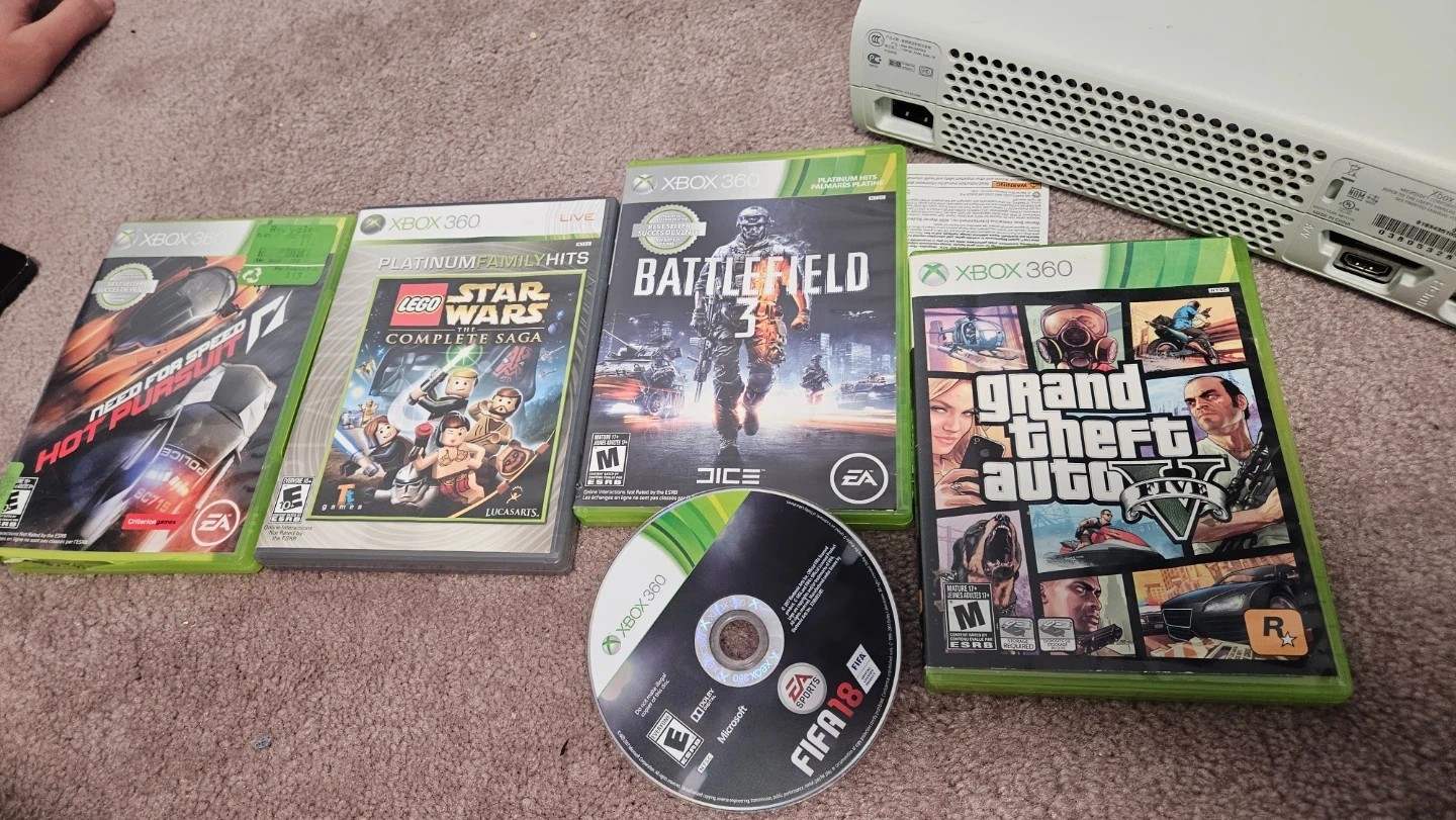 Selling an Xbox 360 console with a few games and accessories! It comes with the power adapter and two controllers. The games included are Grand Theft Auto V, Battlefield 3, Need for Speed Hot Pursuit, Lego Star Wars The Complete Saga, and FIFA 18. Perfect for some retro gaming fun!