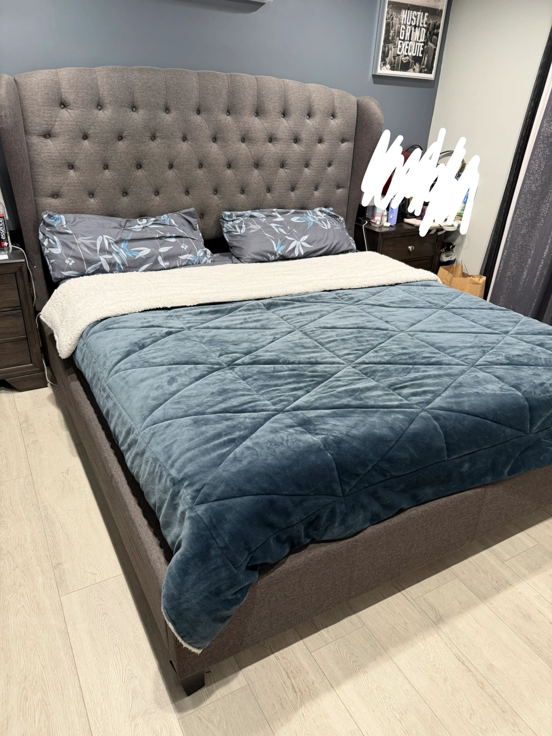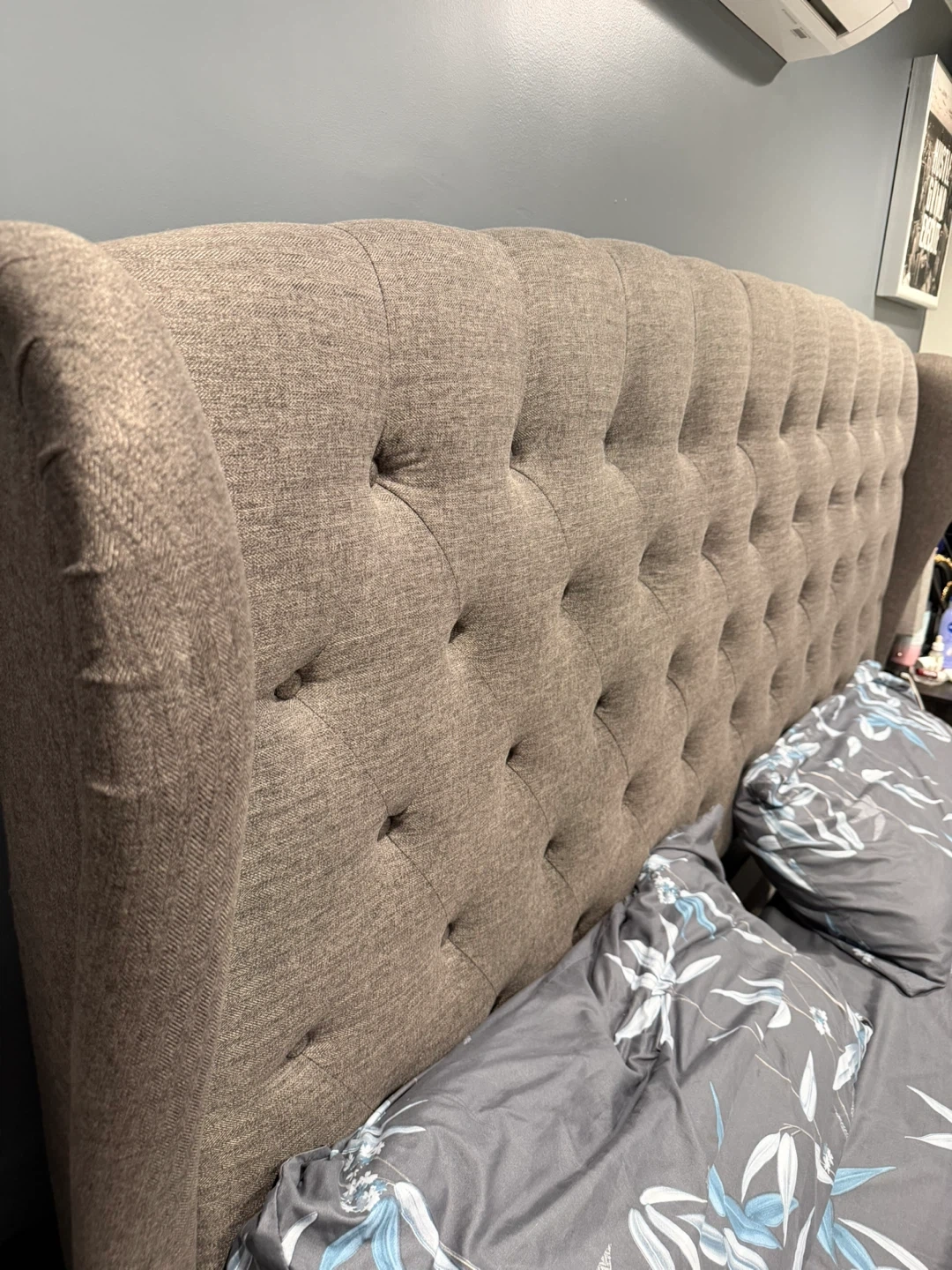 Tufted wingback upholstered bed frame (king size ) Comes in a neutral grey fabric. Includes headboard ,footboardand spring board.