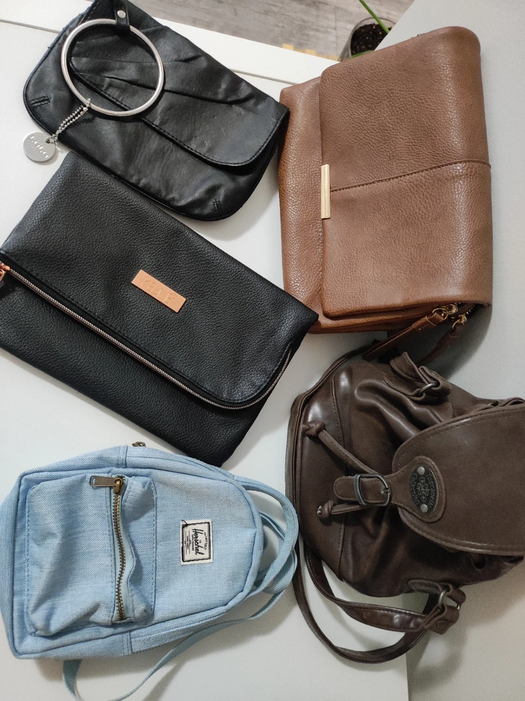 A collection of five assorted women's handbags. Includes a black clutch with a ring handle, a black pebbled leather foldover clutch with a rose gold zipper, a tan faux leather cross-body bag, a distressed brown leather drawstring bucket bag, and a light blue denim Herschel mini backpack. Various materials and colours. $20 for all. Need gone ASAP. Located in East Village Downtown