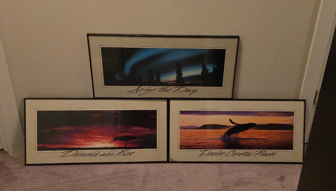This set includes three framed art prints. Each piece has a high-quality tempered glass front. The frames are constructed from precision-cut, extruded aluminum with a polished finish. They feature an innovative hanging system for easy installation. These would brighten any room! Each come with motivation quote to start your day!