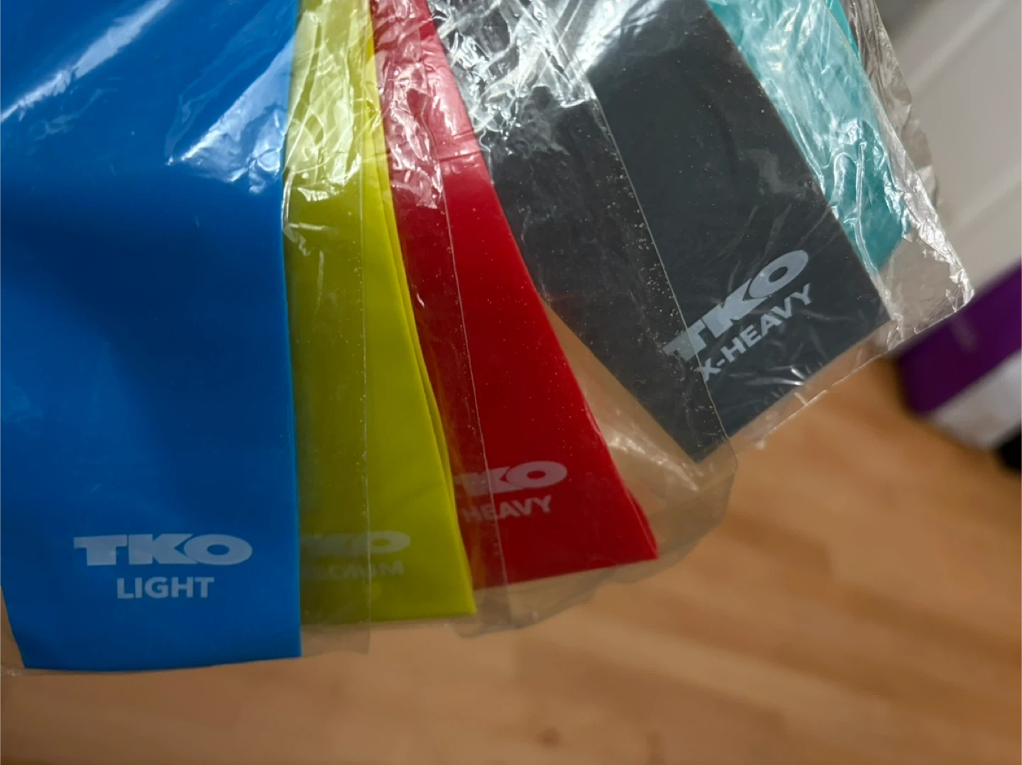 Set of TKO resistance bands including light, medium, heavy, and x-heavy options. Durable and versatile for various workouts. Elastic material construction.