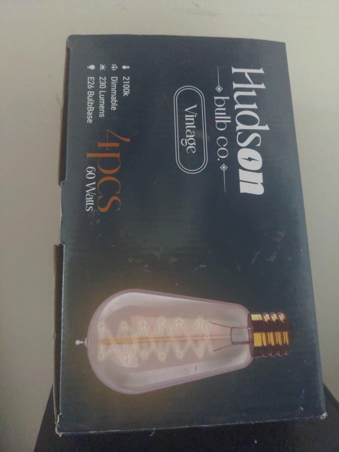 Hudson Bulb Co. offers a 4-pack of vintage-style Edison bulbs. These bulbs are 60 watts and dimmable, providing 230 lumens each. They're designed for a 2100K warm light. E26 bulb base.