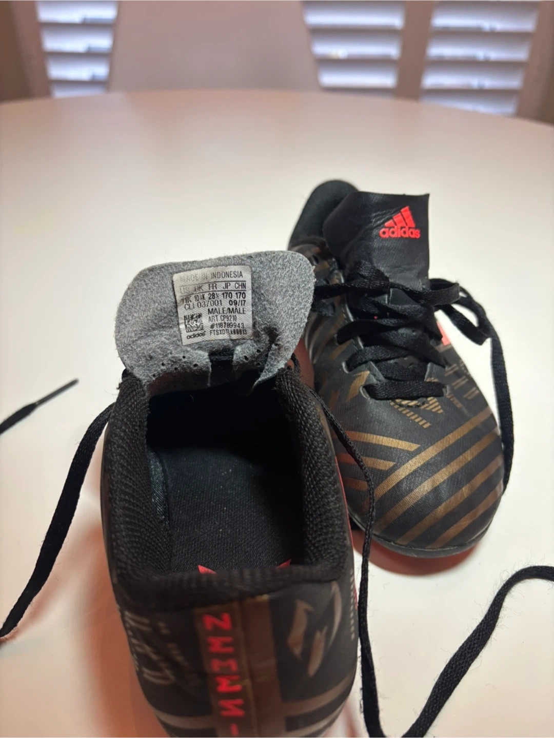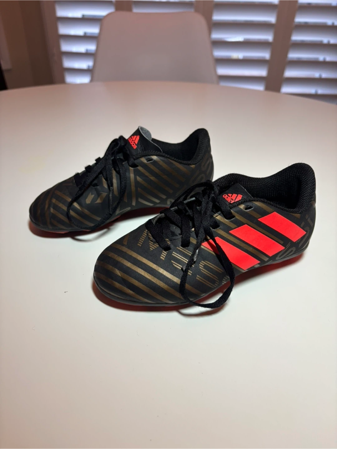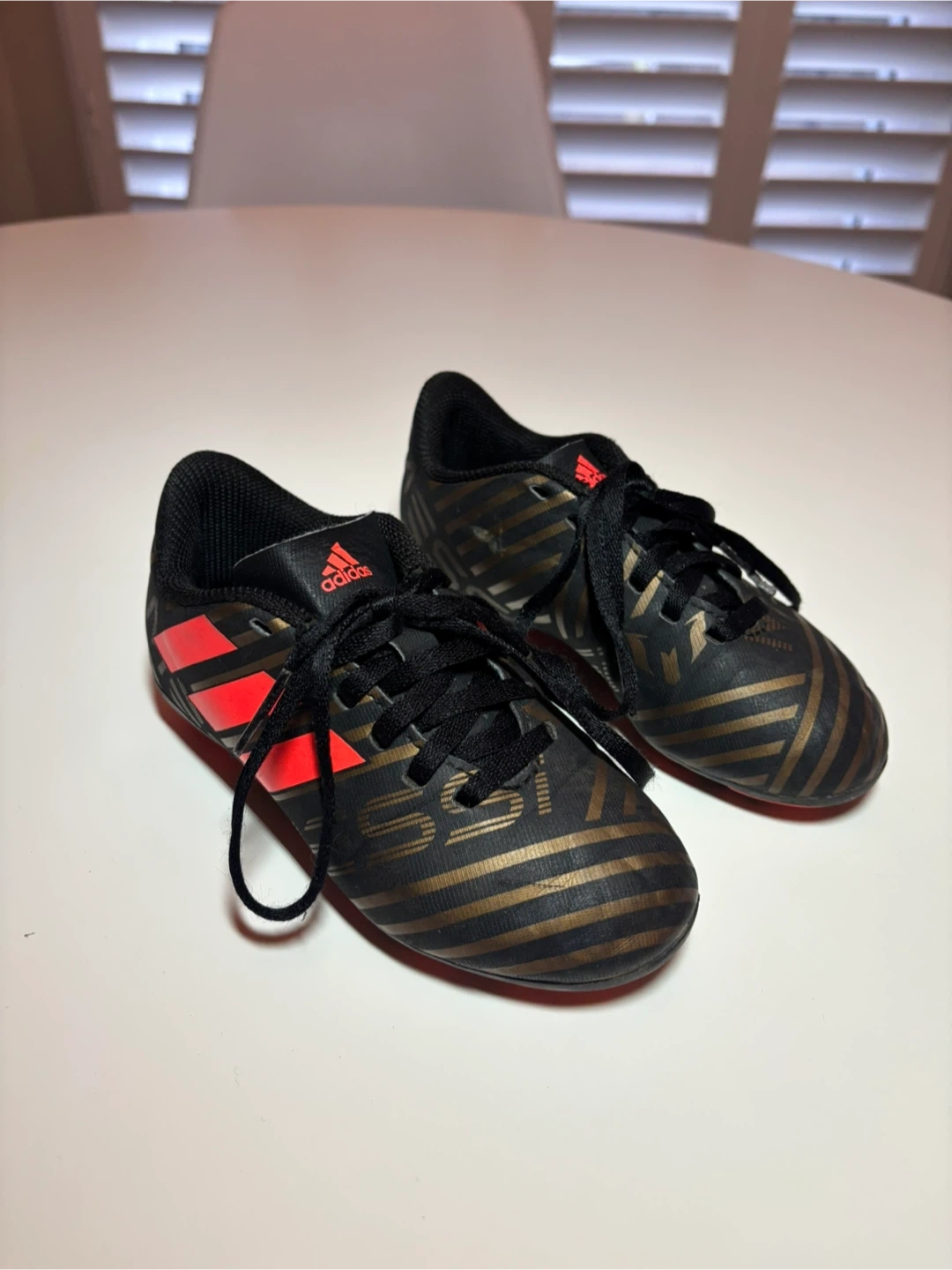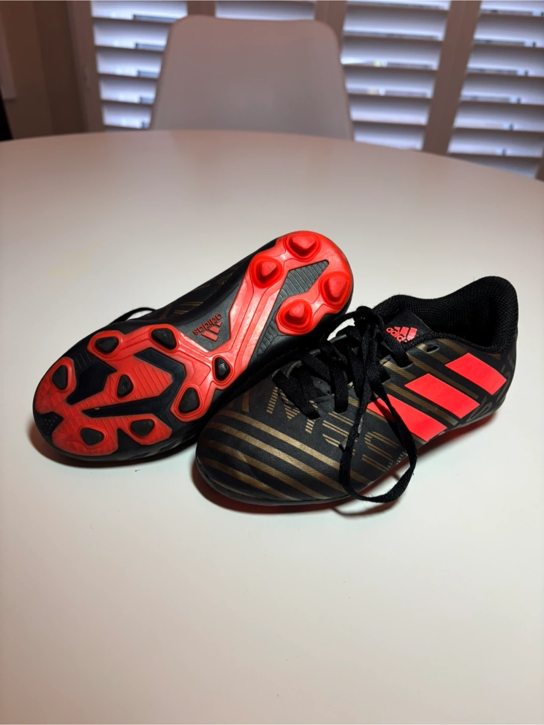 Youth Adidas soccer cleats in black with gold stripes and red accents. Size is 11 little kids.