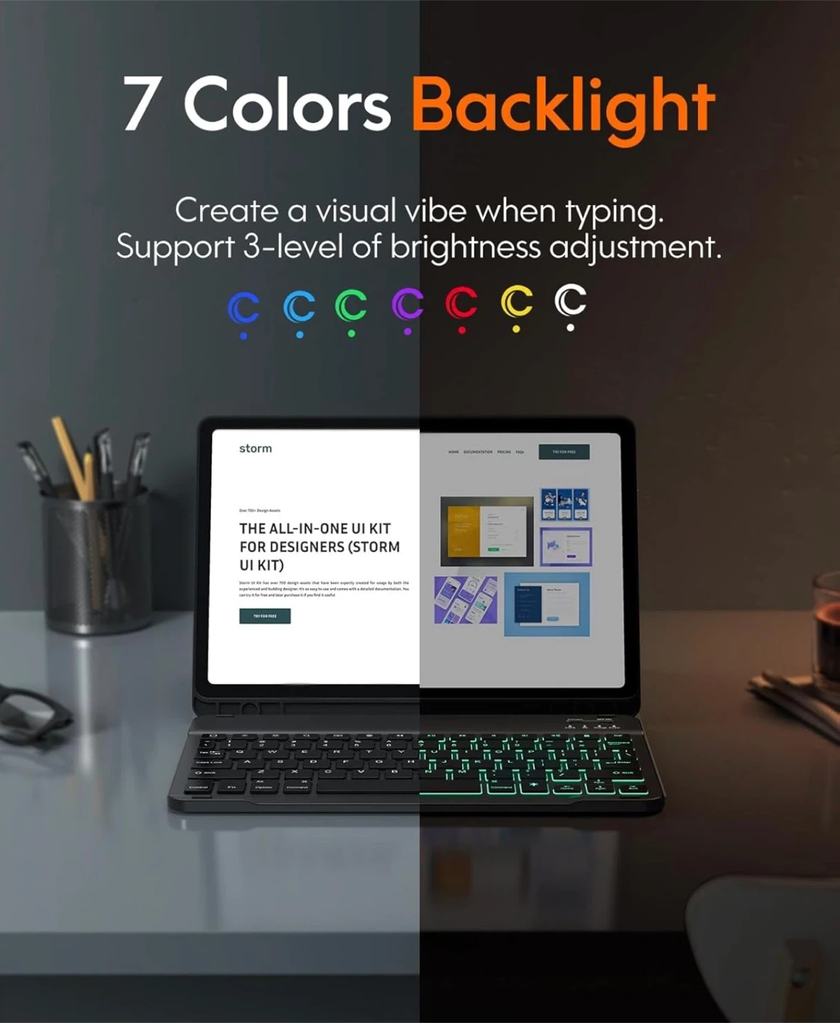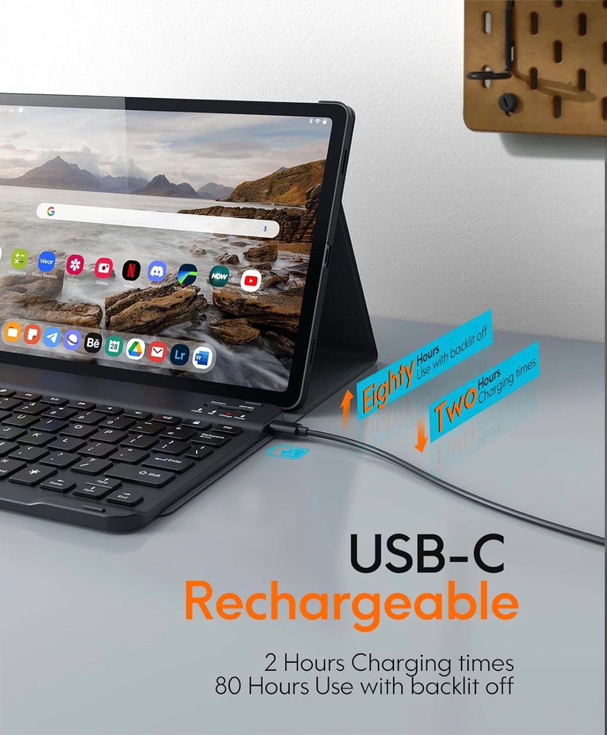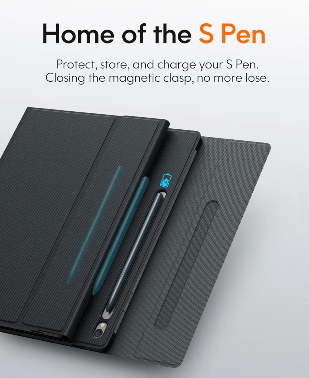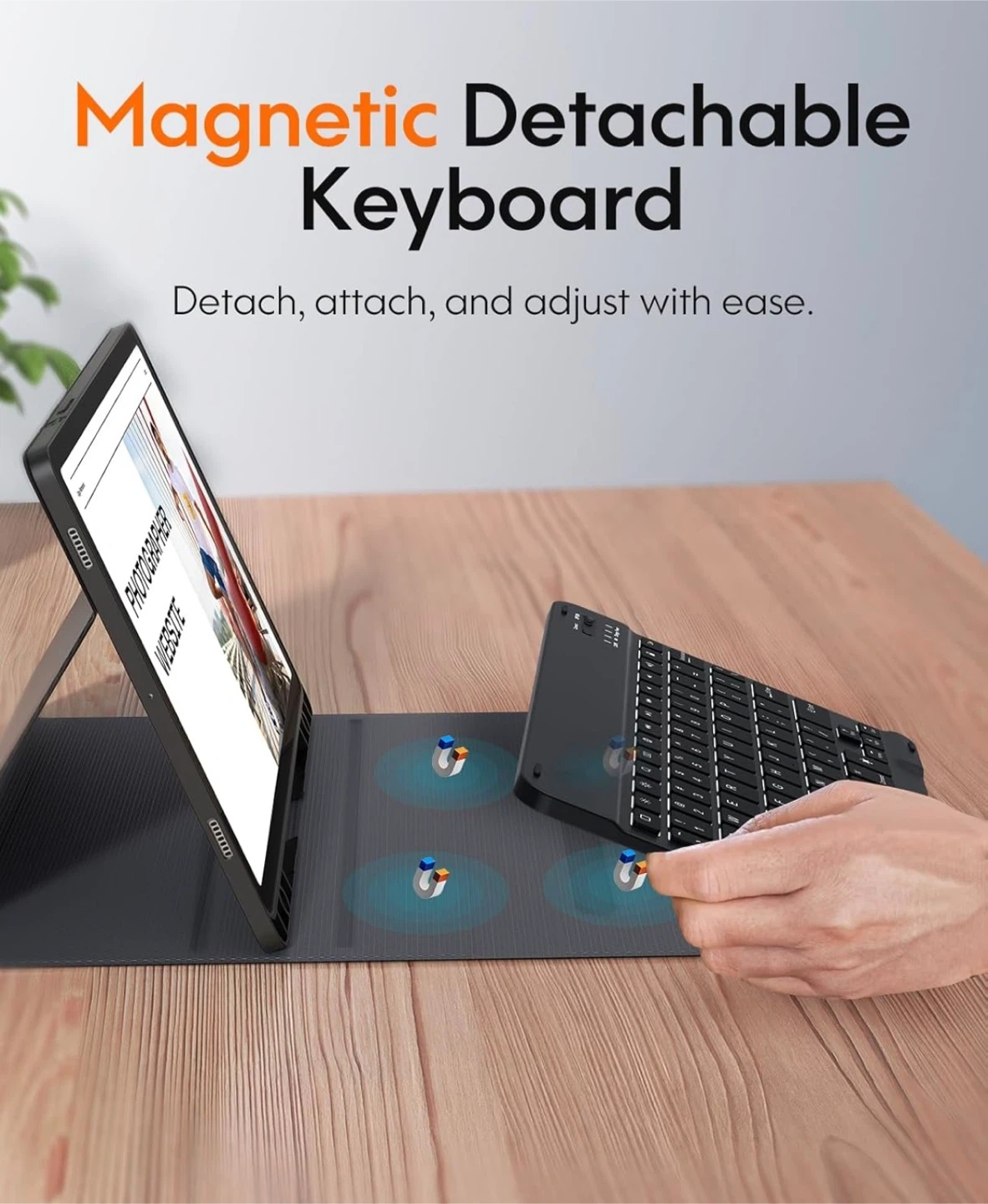 This case features a magnetic detachable keyboard with 7-color backlight and 3 brightness levels. It also includes an S Pen holder with magnetic closure for easy storage and charging. This case is compatible with Samsung Galaxy Tab S10 FE 10.9-inch and S9 FE 10.9-inch, as well as the S9 11-inch model.
