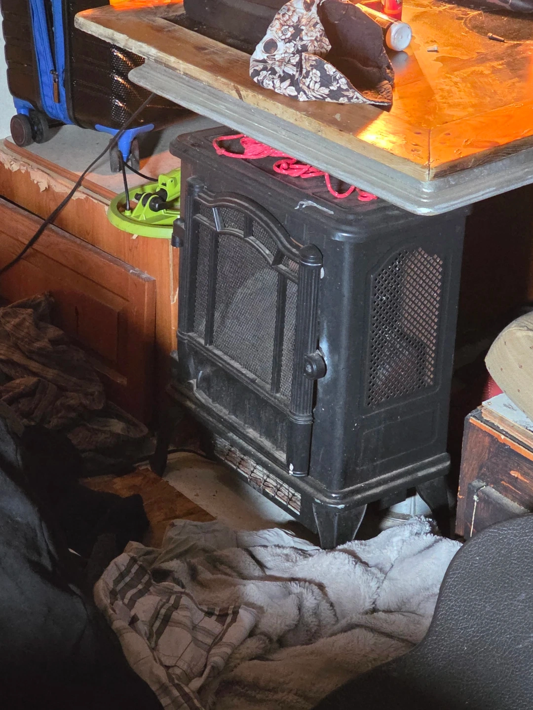 This is a black electric heater, likely for a small space. It features a decorative grille on the front. A red cord is visible on top. Not sure what up with it works when it wants to..