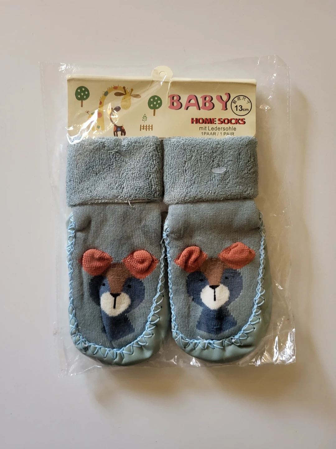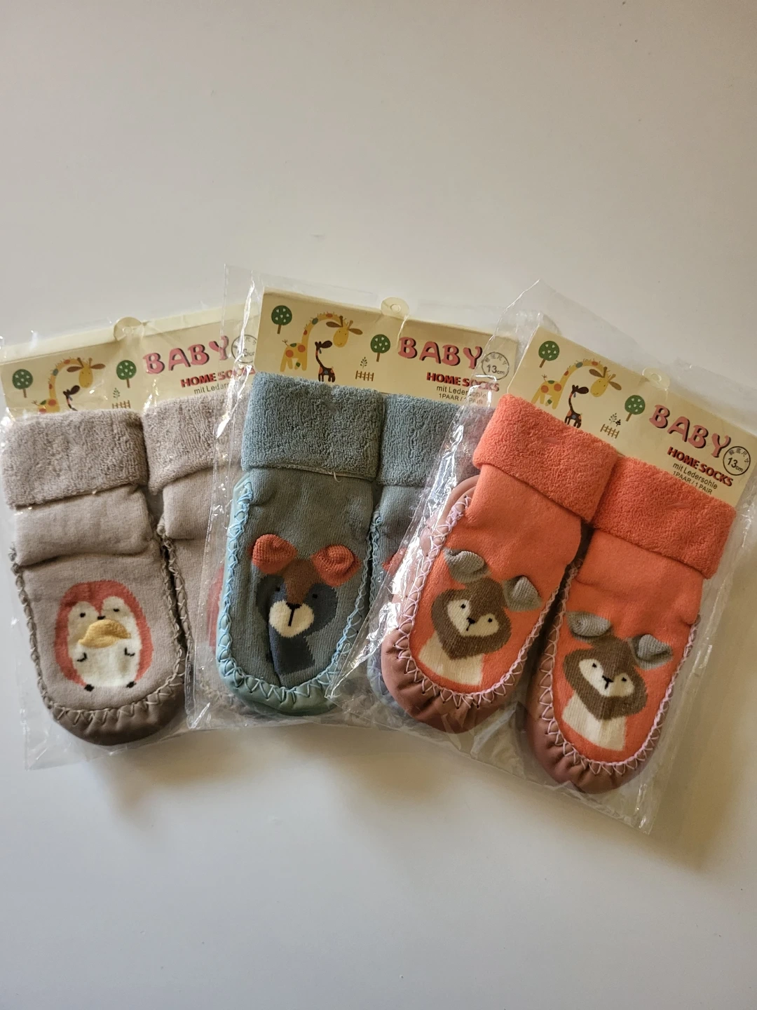 These are baby home socks featuring cute animal designs. They're made with a soft fabric and have a durable sole for grip. Available in 2 adorable styles!