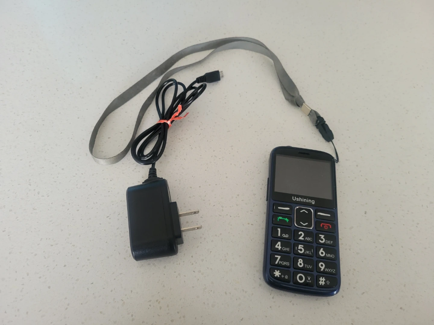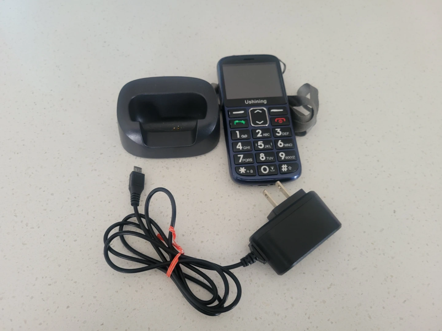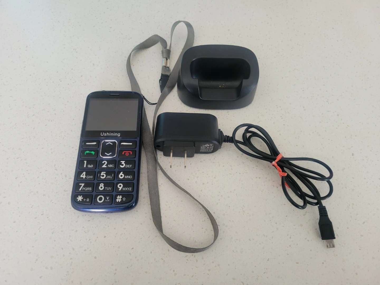 This Ushining basic phone comes in a dark blue colour and includes a charging dock, a power adapter, and a lanyard. It's designed for simple communication needs gently used by a senior.