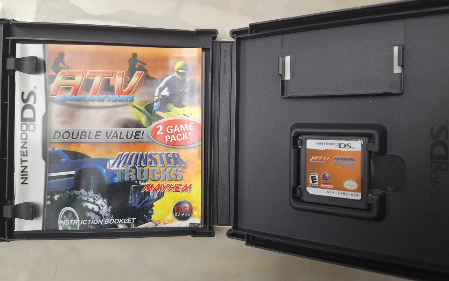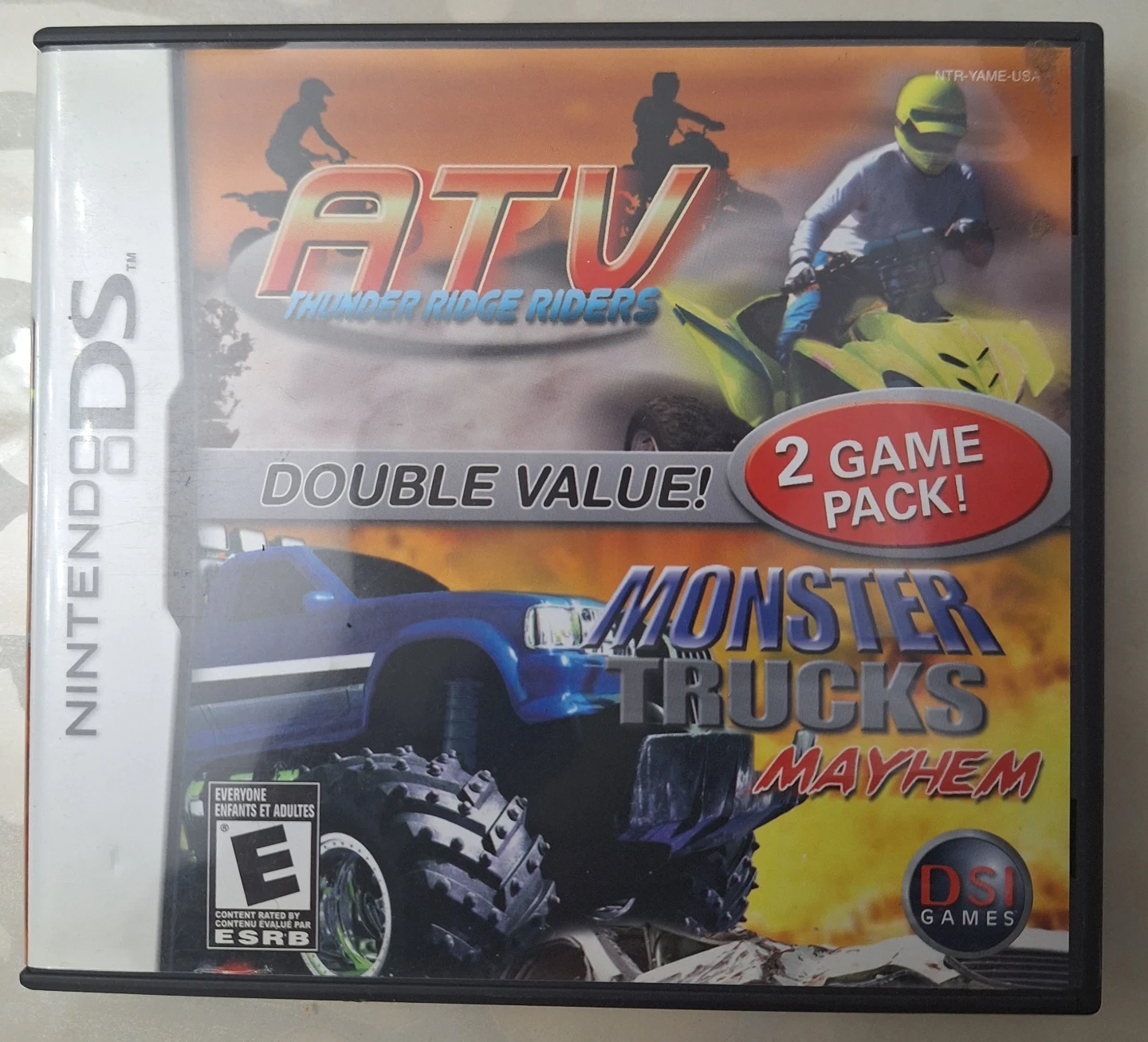 This is a 2-game pack for the Nintendo DS featuring ATV Thunder Ridge Riders and Monster Trucks Mayhem. It includes the game cartridge and instruction booklet. Perfect for racing game fans!