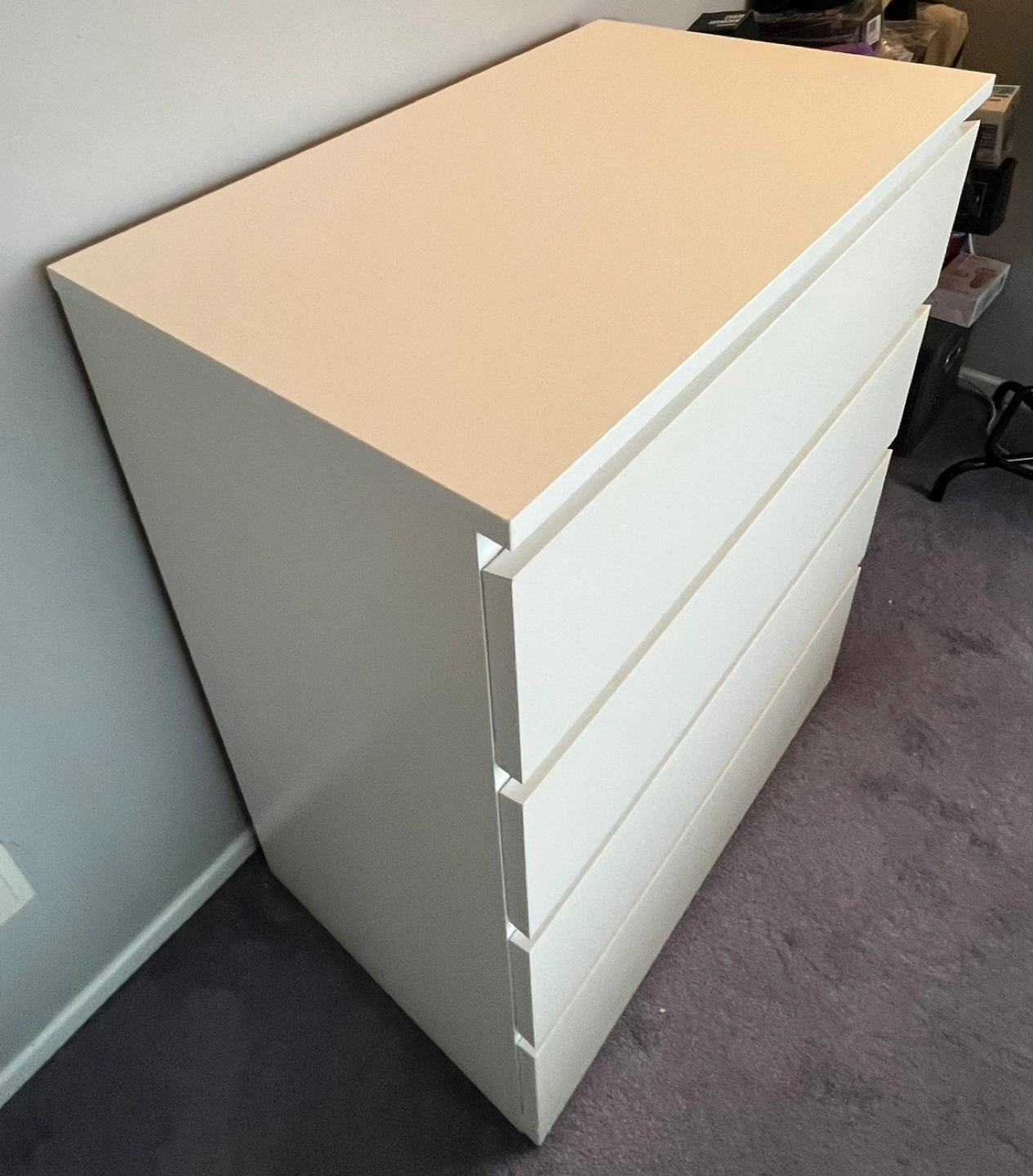 White four-drawer dresser. Excellent storage solution. Assembled and ready to use. Simple design, great for bedroom or other space.