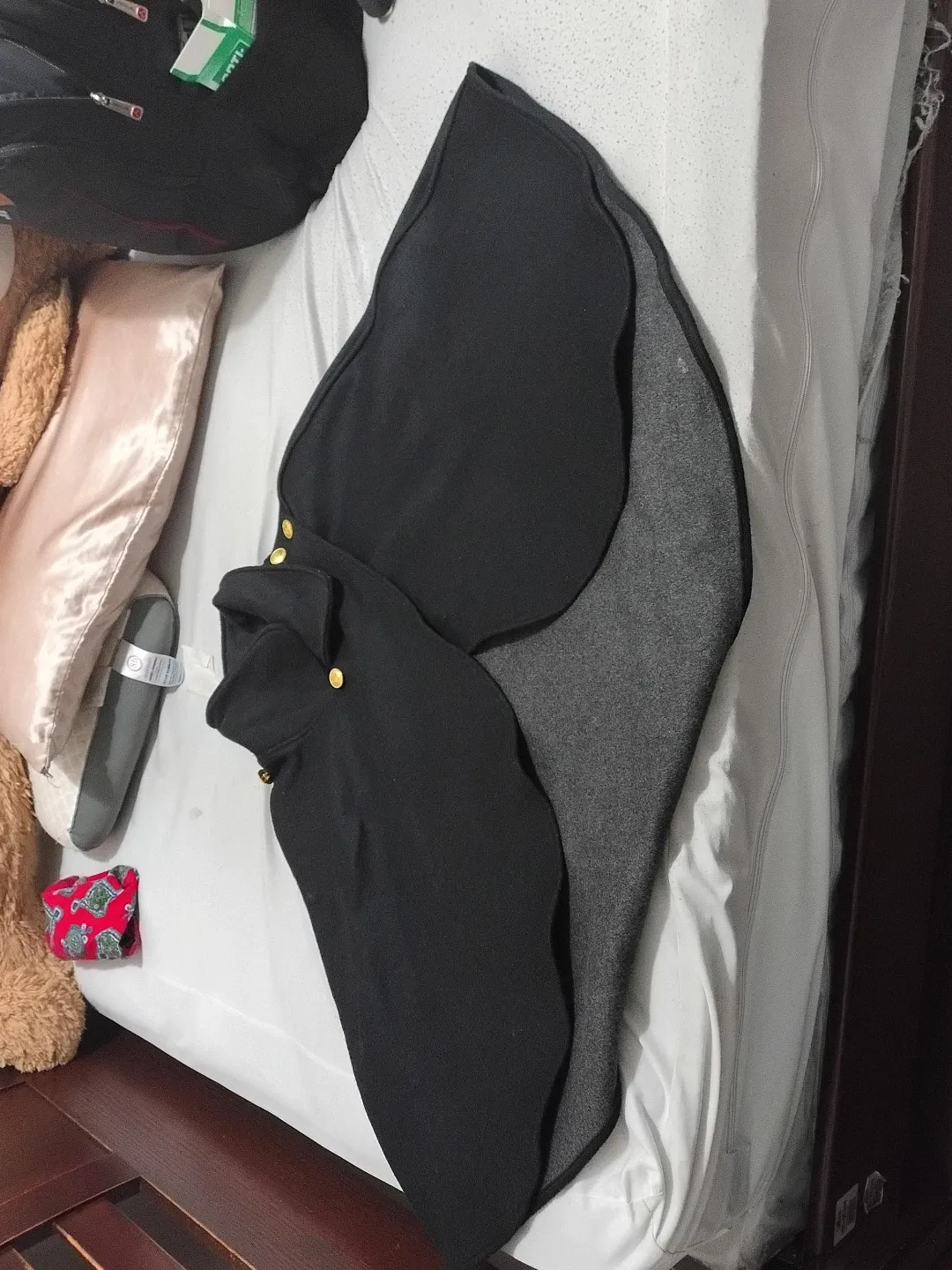 This black cape scarf features decorative gold buttons along the collar. It's lined with a soft grey fabric for added warmth. The unique shape offers versatile styling options for cooler weather.