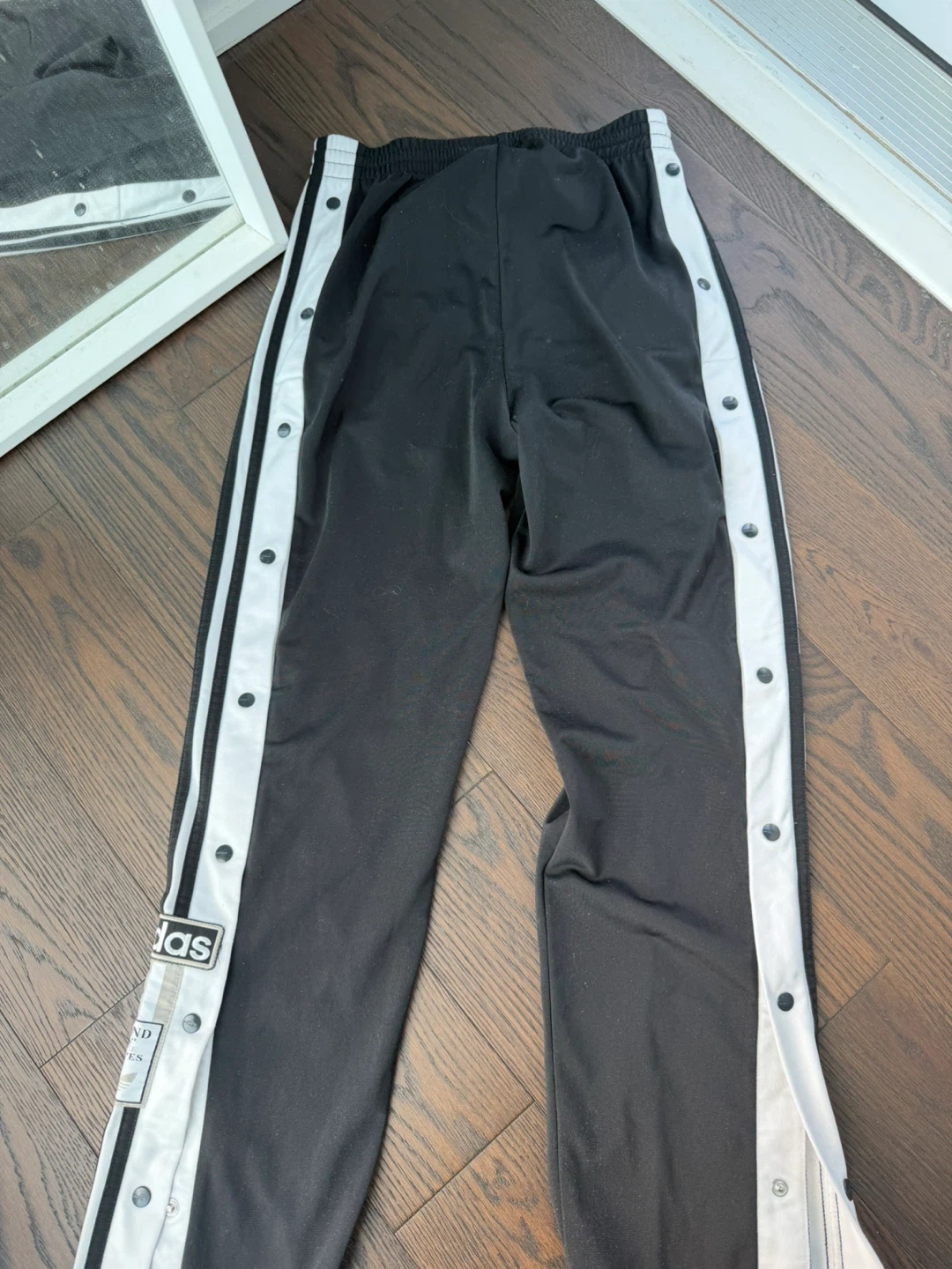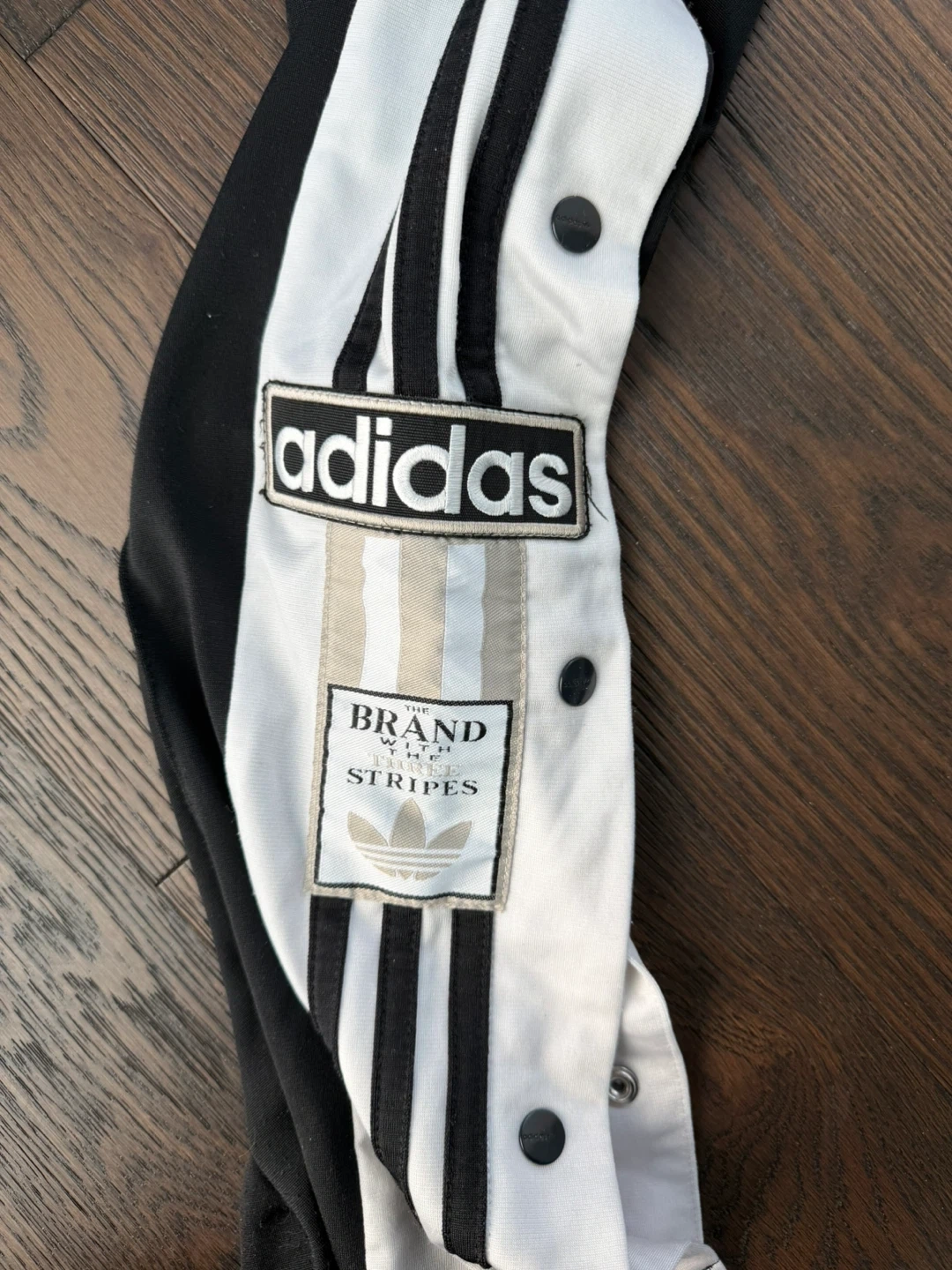 Black Adidas Adibreak track pants featuring the iconic white 3-stripes down the sides. These pants have snap buttons along the leg for adjustable styling. Made from polyester material.