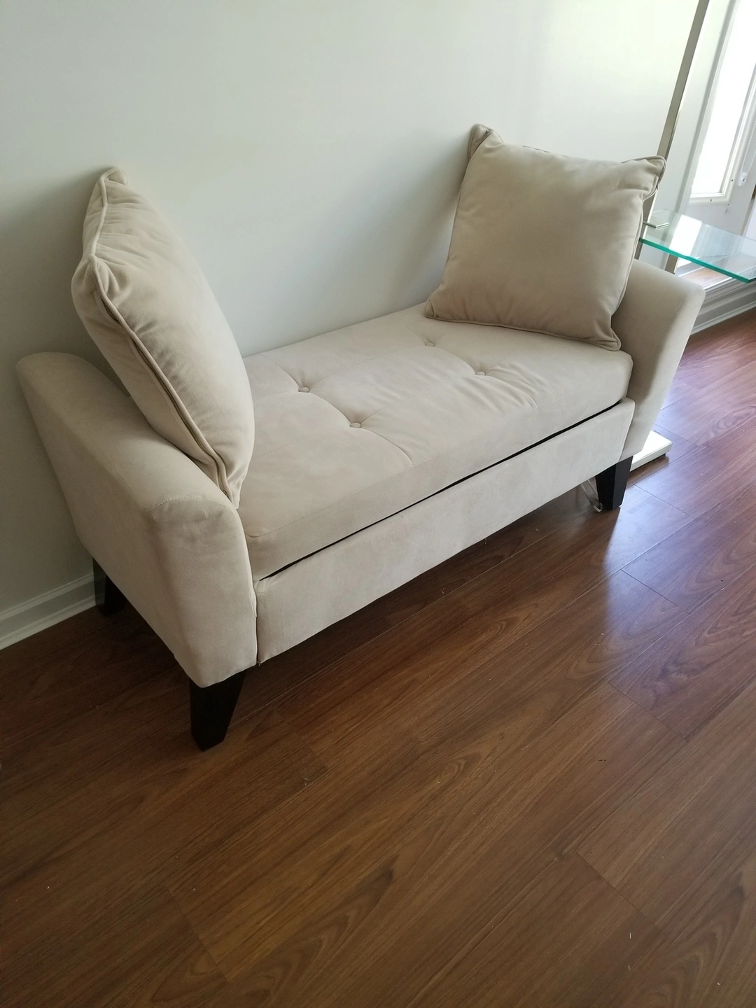 Beige storage bench with two pillows, perfect for an entryway or living room. The seat opens for storage. Has black legs.