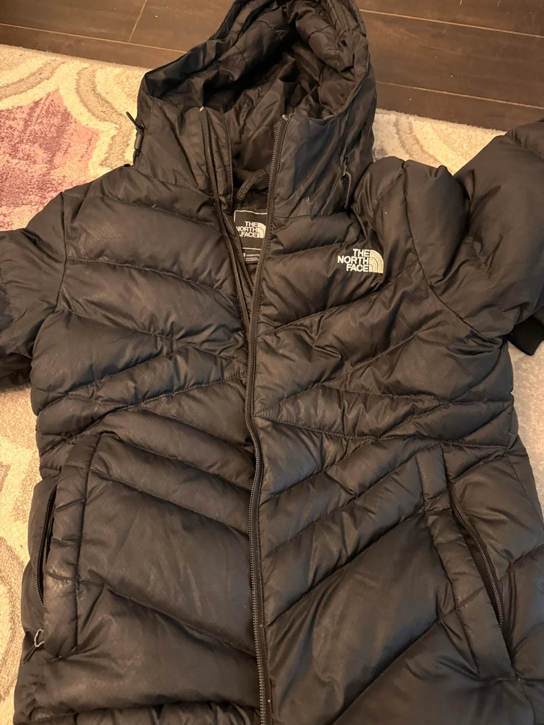 A black puffer jacket from The North Face. It's a warm and stylish winter coat. Features a hood and zippered pockets.
