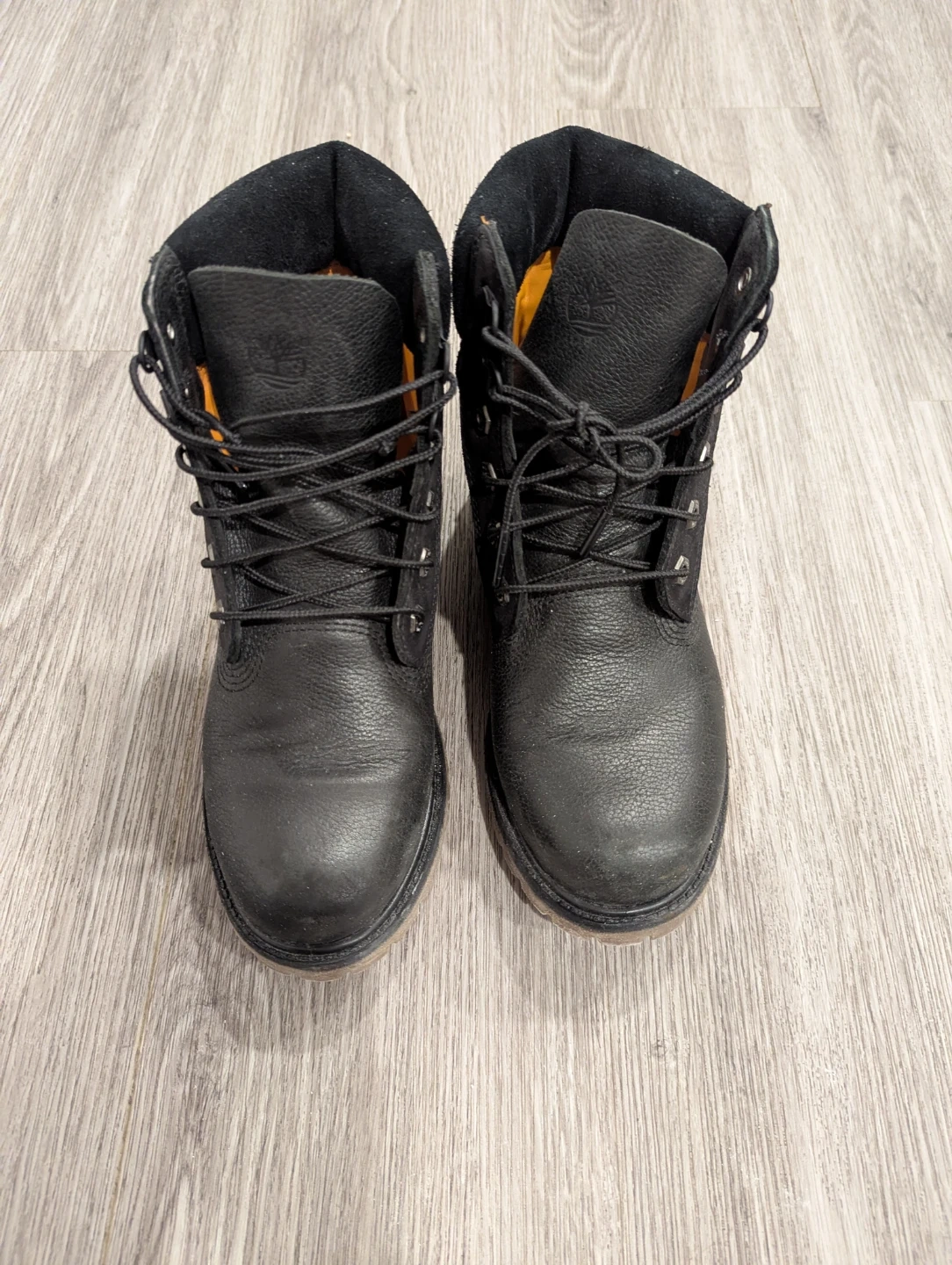 Classic black leather lace-up boots from Timberland. These boots are designed for durability and comfort. Features a sturdy sole and lace-up closure for a secure fit.