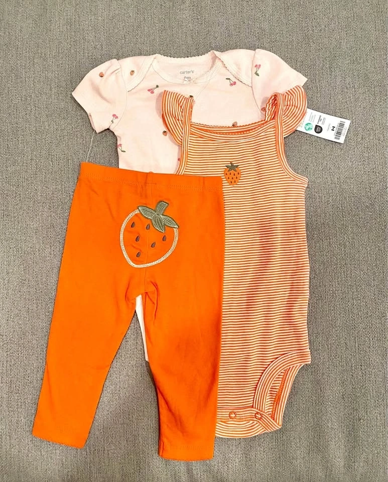 Includes 2 diaper shirts and 1 pair of pants. Cute strawberry & fruit theme.