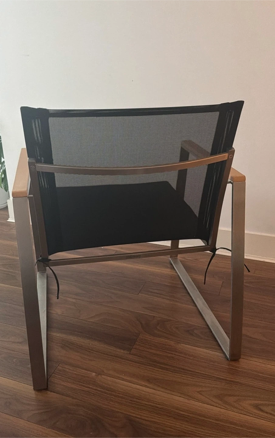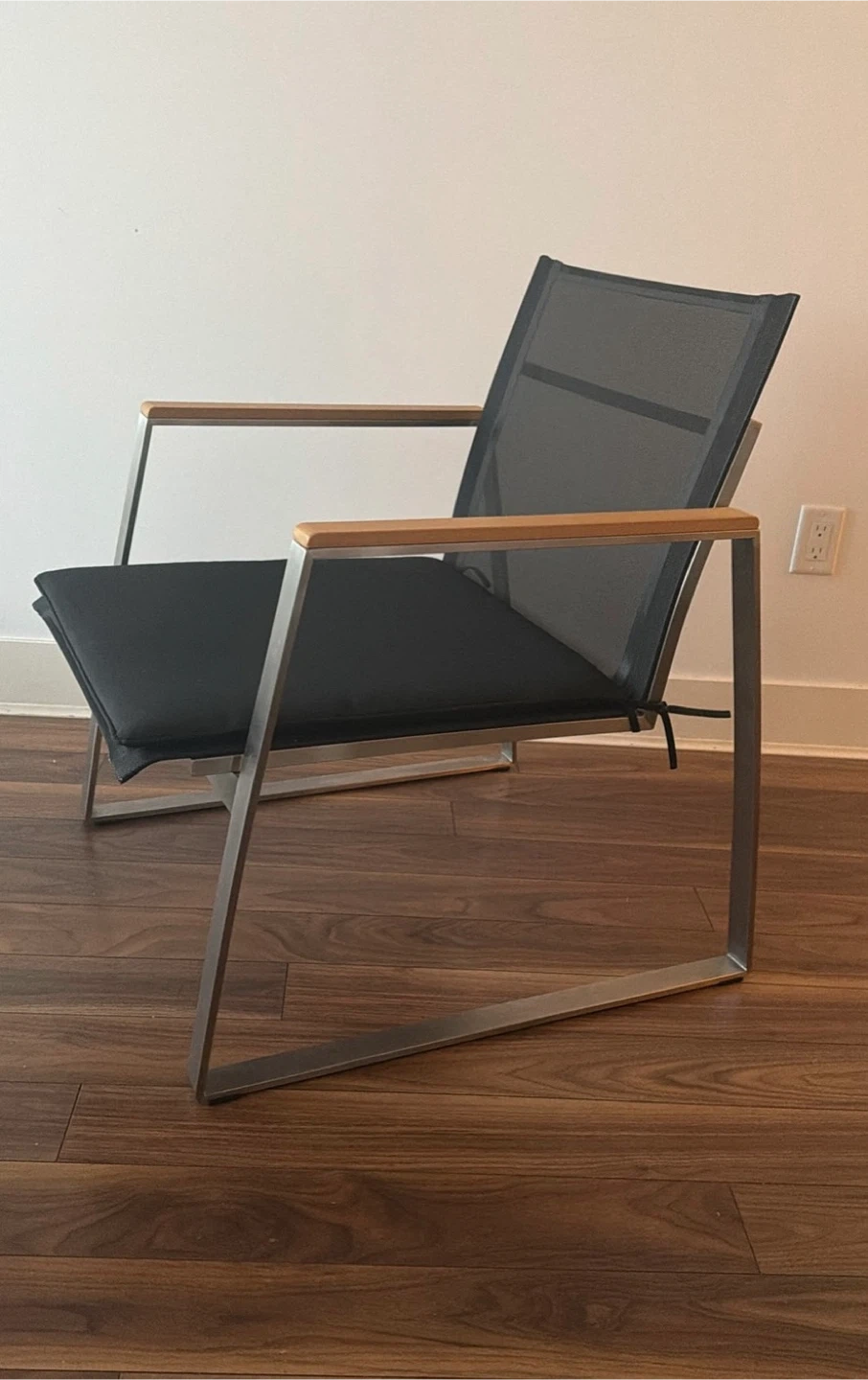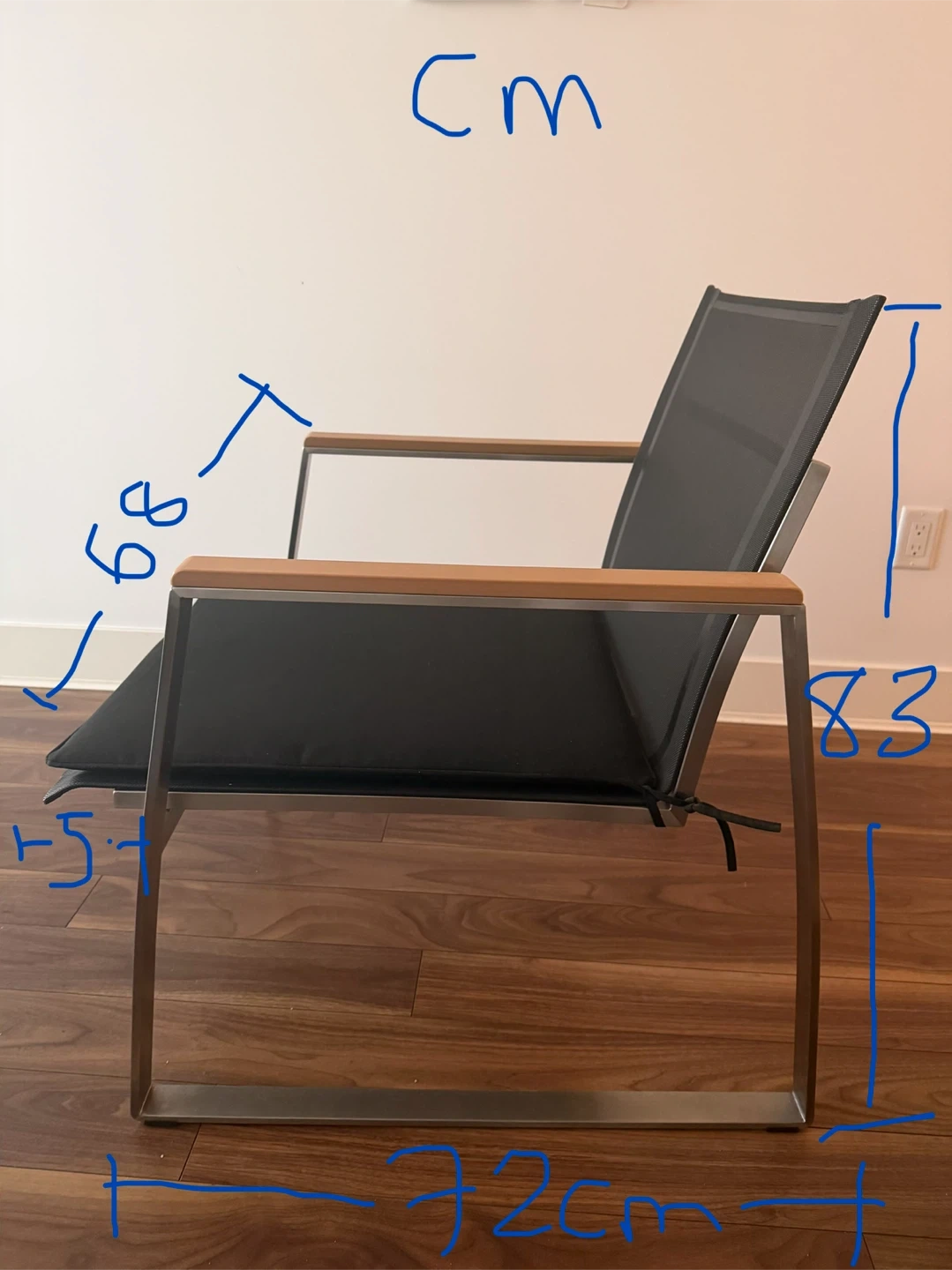 Selling a stylish outdoor lounge chair with a modern design. It features a sleek frame and comfortable seating. The dimensions are approximately 68cm in height, 72cm in width, and 83cm in depth. Perfect for relaxing on your patio or deck!