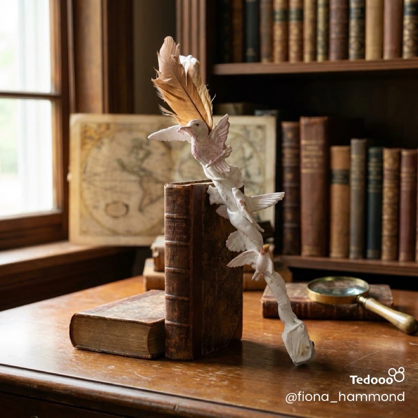This unique wand features delicate pink birds climbing a twisted branch, topped with a soft feather. It's a lovely decorative piece for any shelf or desk. The craftsmanship is evident in the detailed sculpting of the birds and their playful arrangement. This item would add a whimsical touch to your home decor or can be fun at a party, parade or festival.
