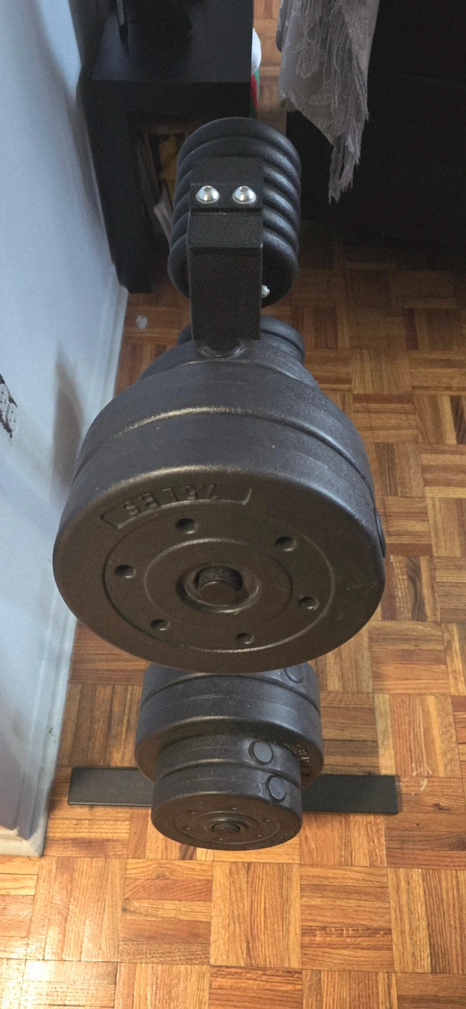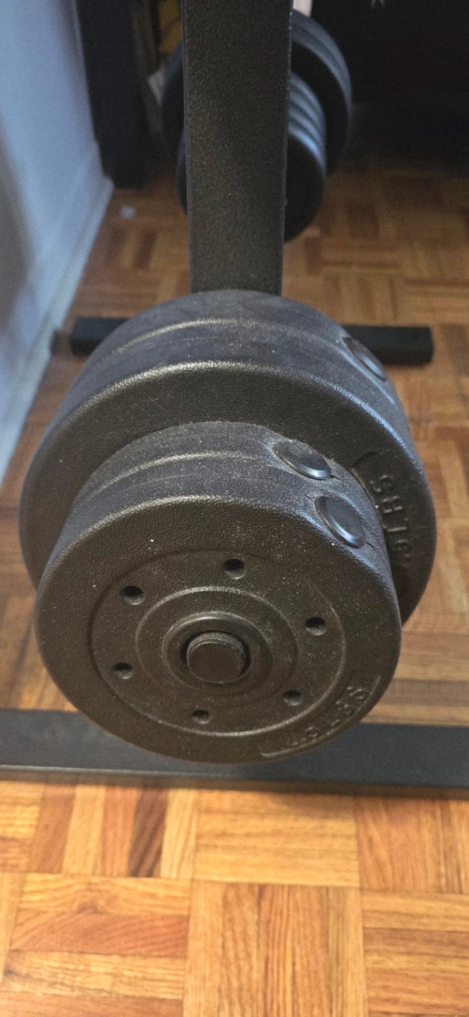 This set includes adjustable dumbbells on a storage rack. The weights are marked in lbs, with some plates reading 2lbs, 5 lbs and others 10 lbs. It's great for home gyms and can be used for a variety of exercises.
