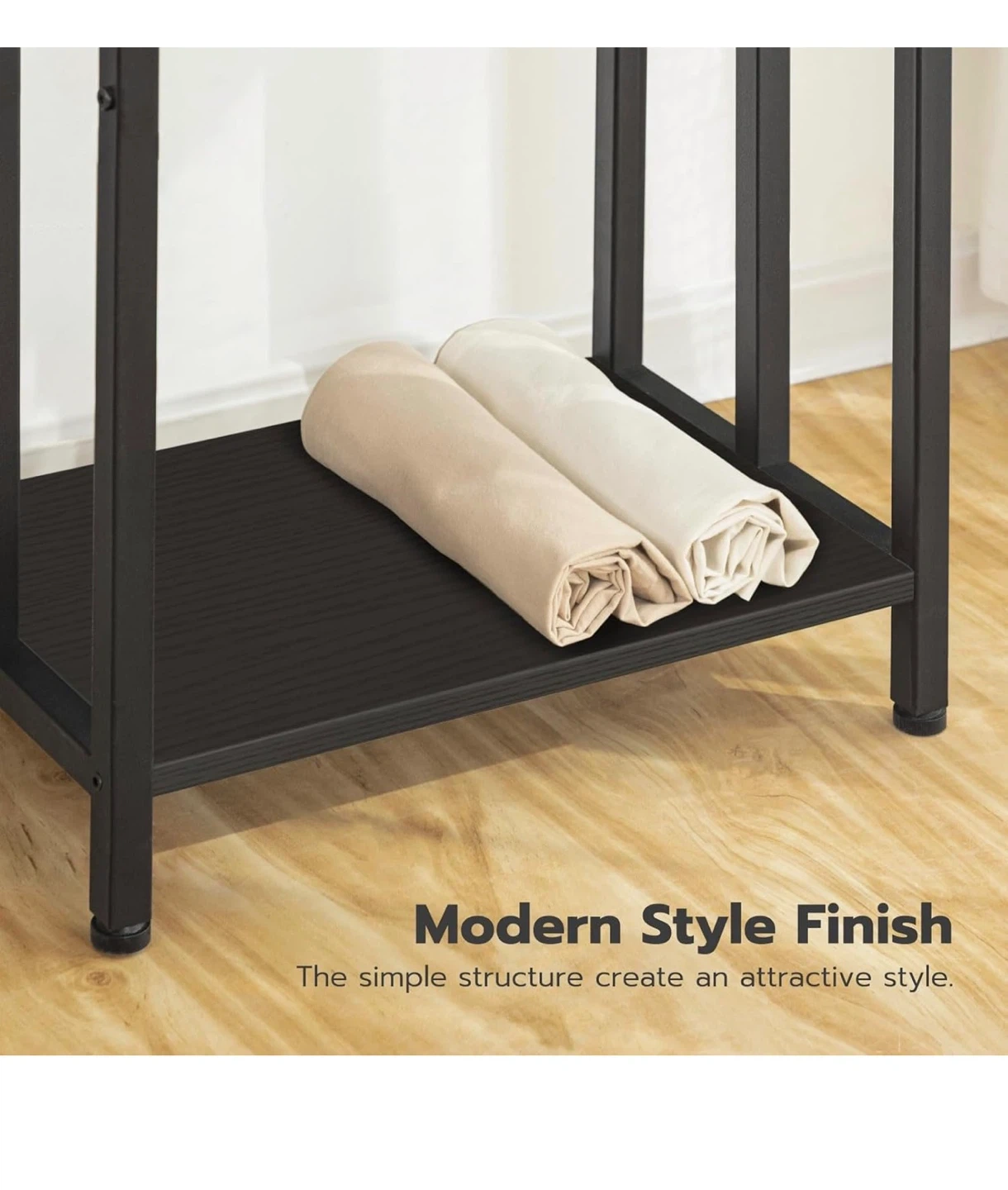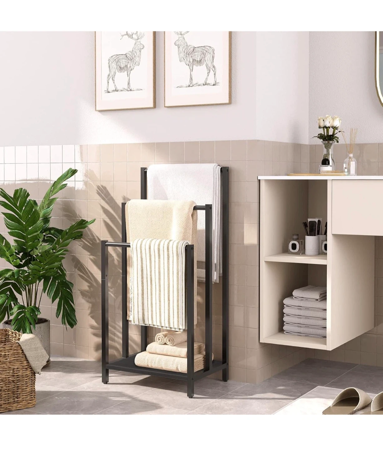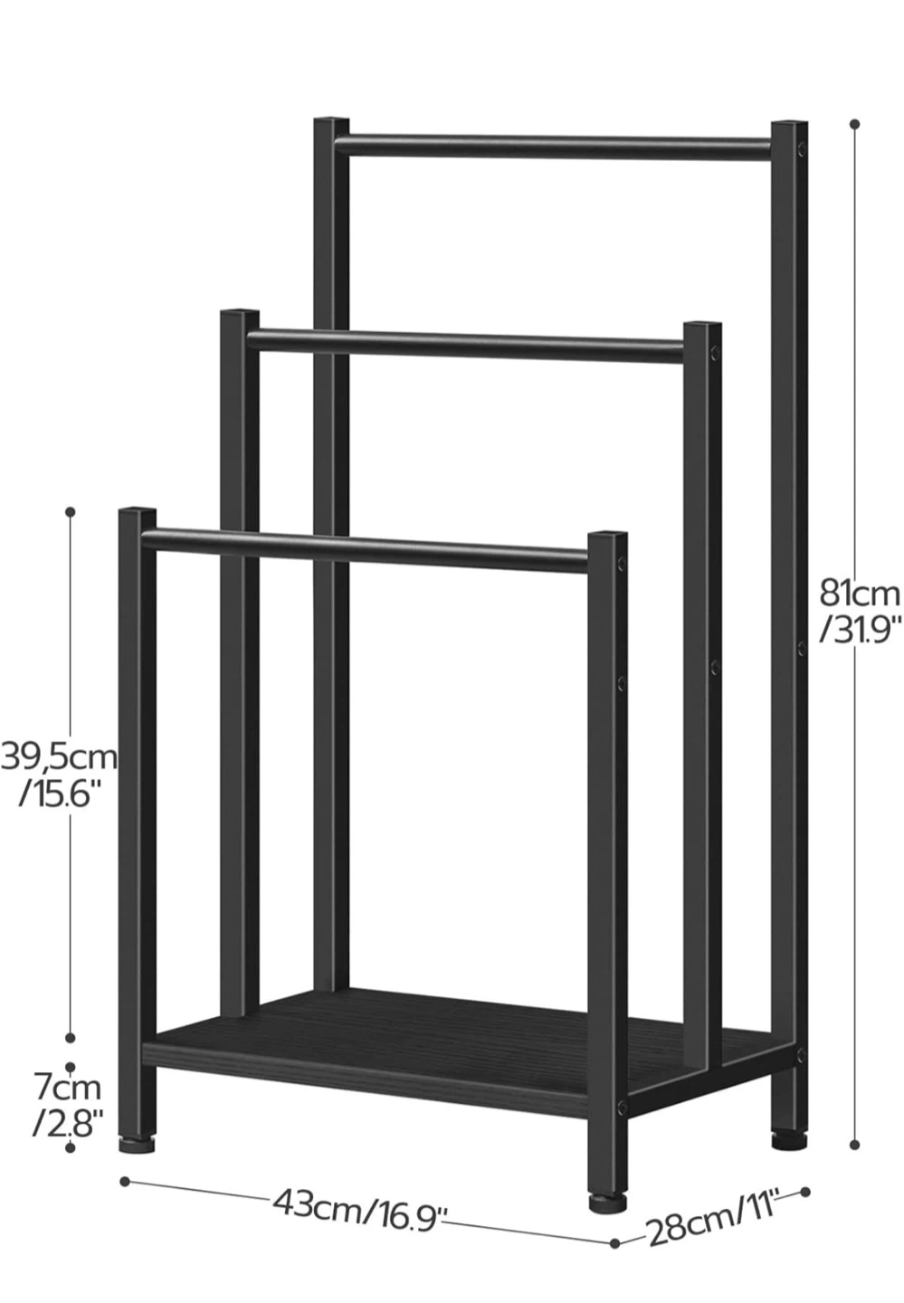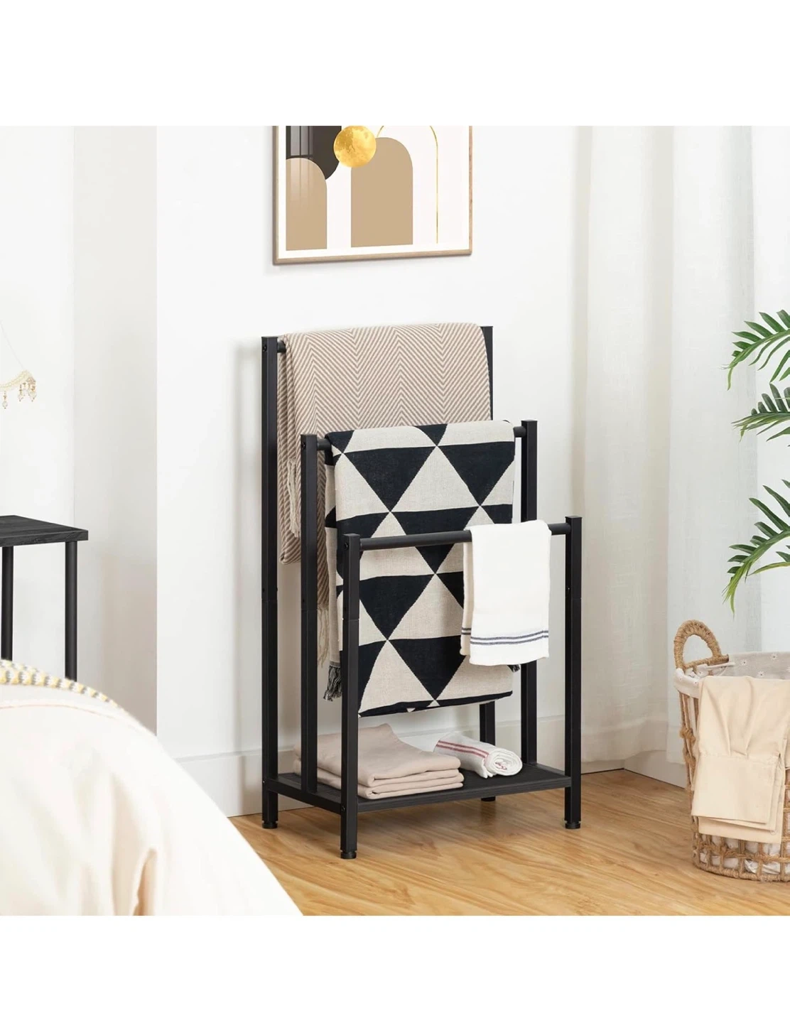 This HOOBRO towel rack features three tiers for hanging blankets or towels. It's made of black metal and includes a bottom shelf for extra storage. Dimensions are 43 x 28 x 81 cm.